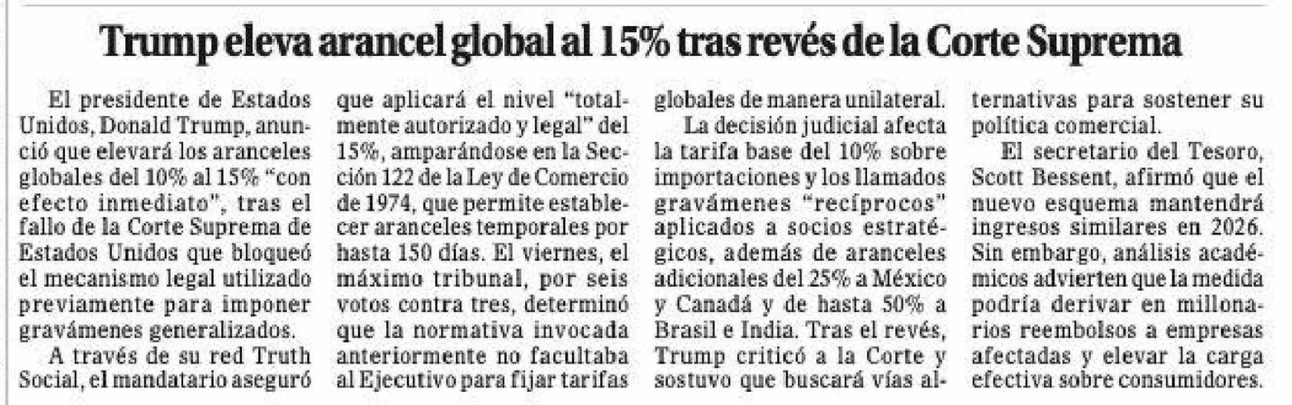 Trump eleva arancel global al 15% tras revés de la Corte Suprema
