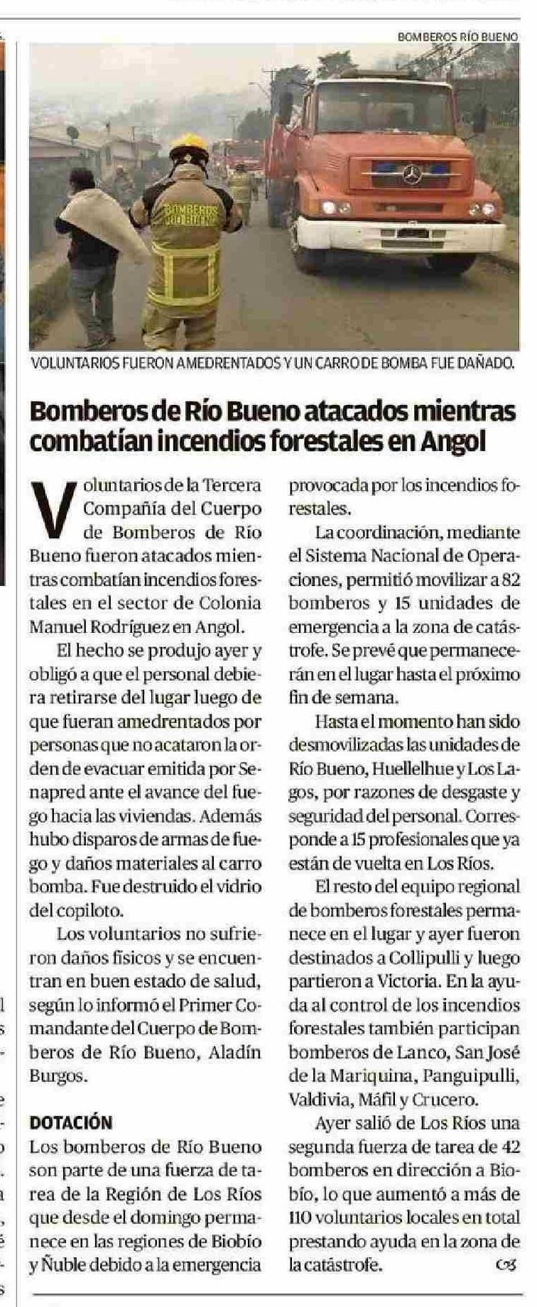 Bomberos de Rio Bueno atacados mientras combatian incendios forestales en Angol