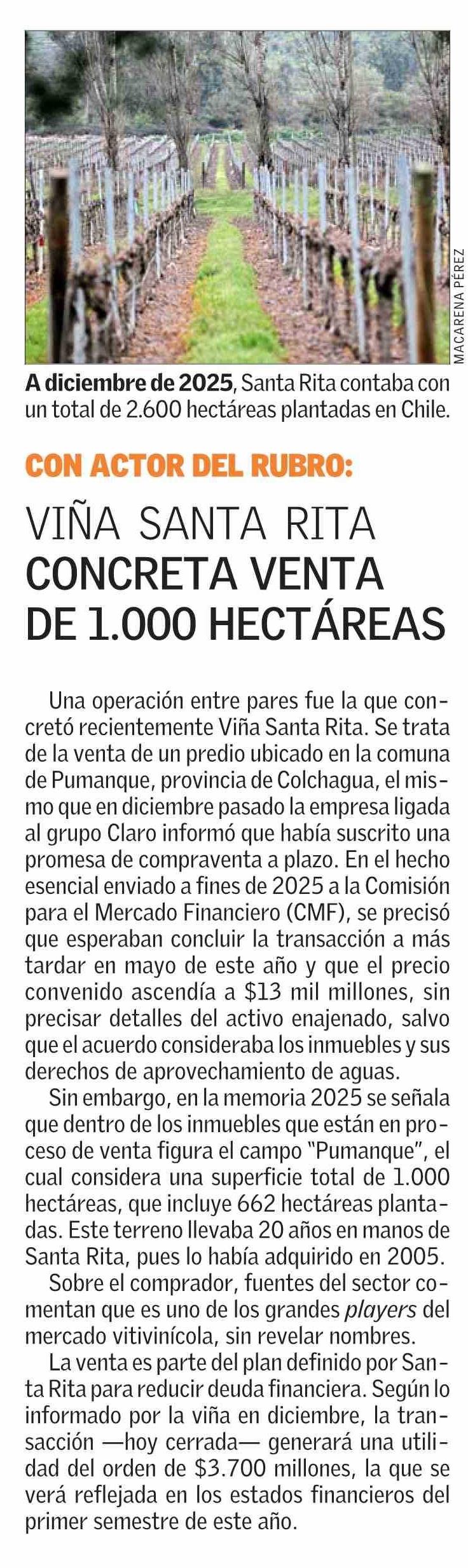 VIÑA SANTA RITA CONCRETA VENTA DE 1.000 HECTÁREAS