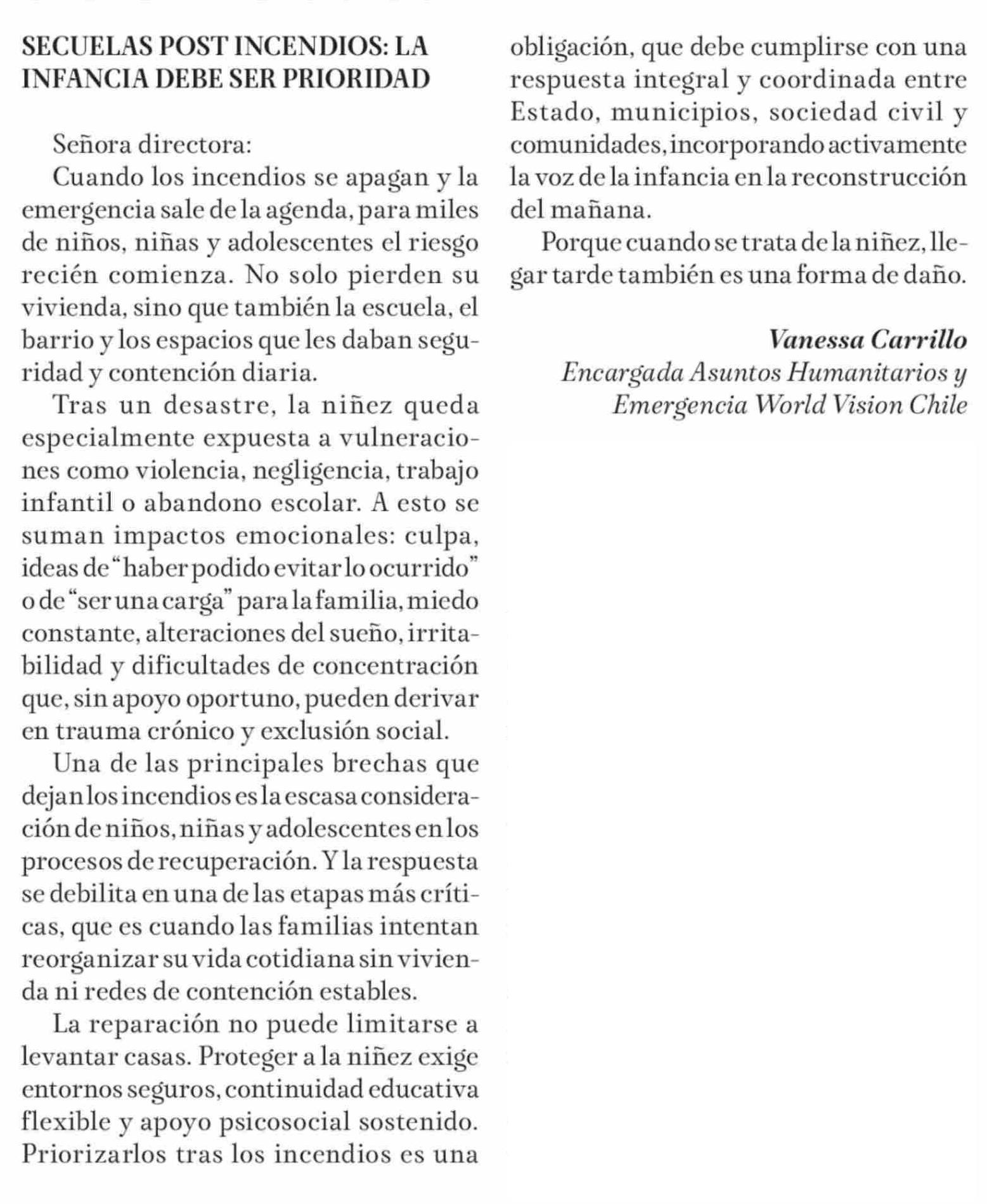 CARTAS: SECUELAS POST INCENDIOS: LA INFANCIA DEBE SER PRIORIDAD
