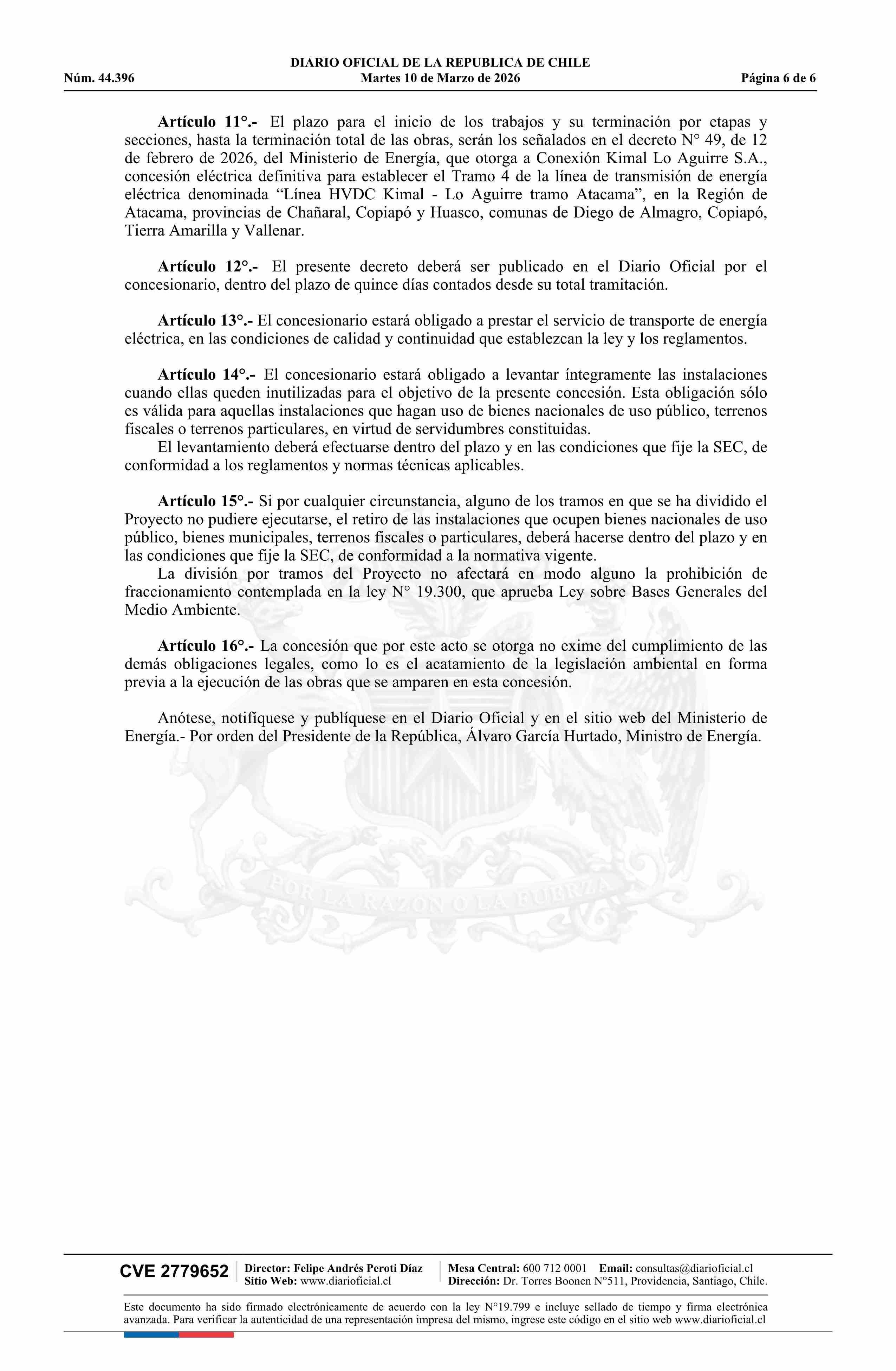 | Título: | Decreto exento número 59, de 2026.- Otorga a Conexión Kimal Lo Aguirre S.A. concesión eléctrica definitiva para establecer el Tramo 1 del proyecto de transmisión de energía eléctrica denominado Línea HVDC Kimal - Lo Aguirre Tramo Atacama, en la Región de Atacama, provincias de Chañaral, Copiapó y Hu |