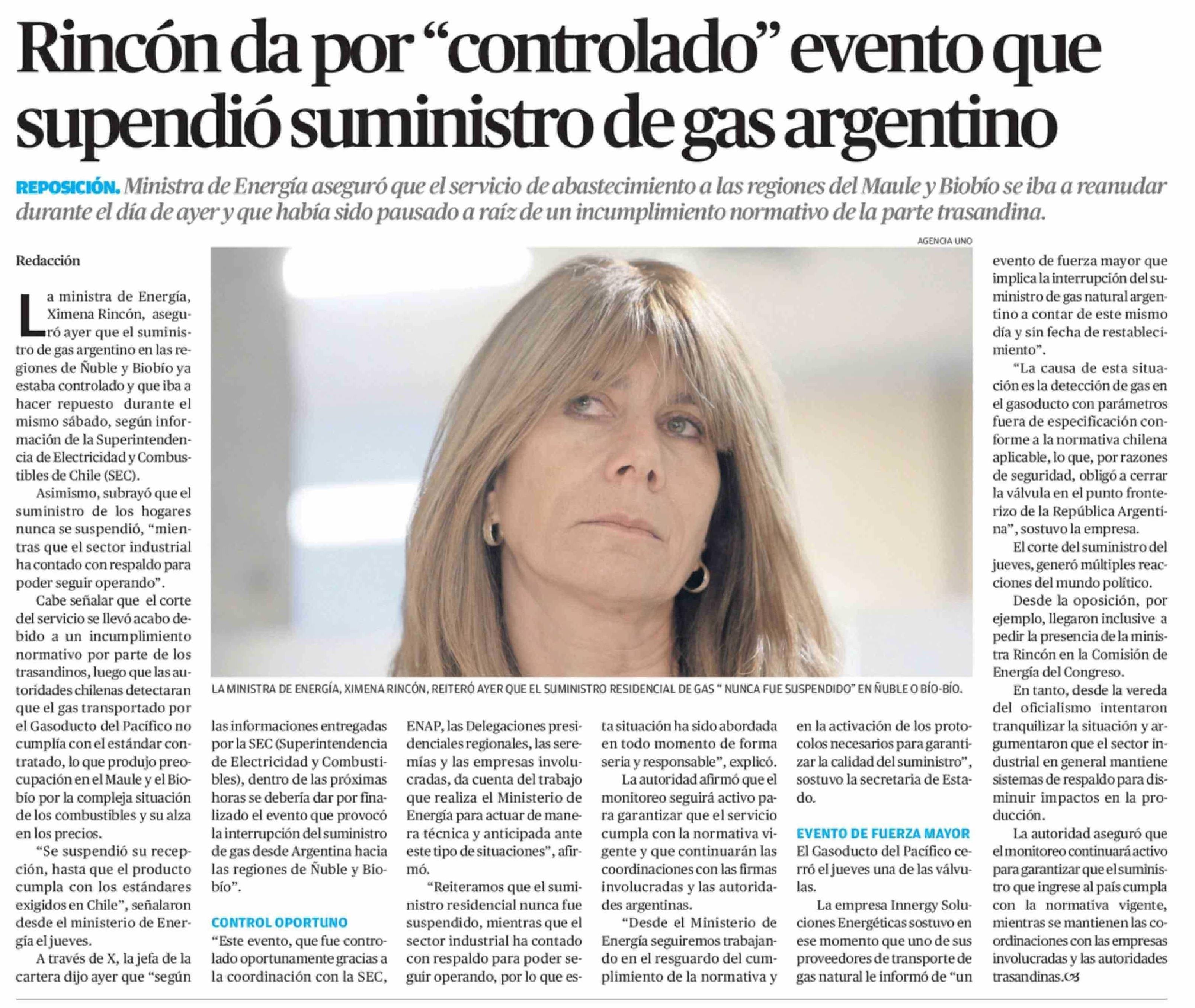 Rincón da por "controlado" evento que supendió suministro de gas argentino