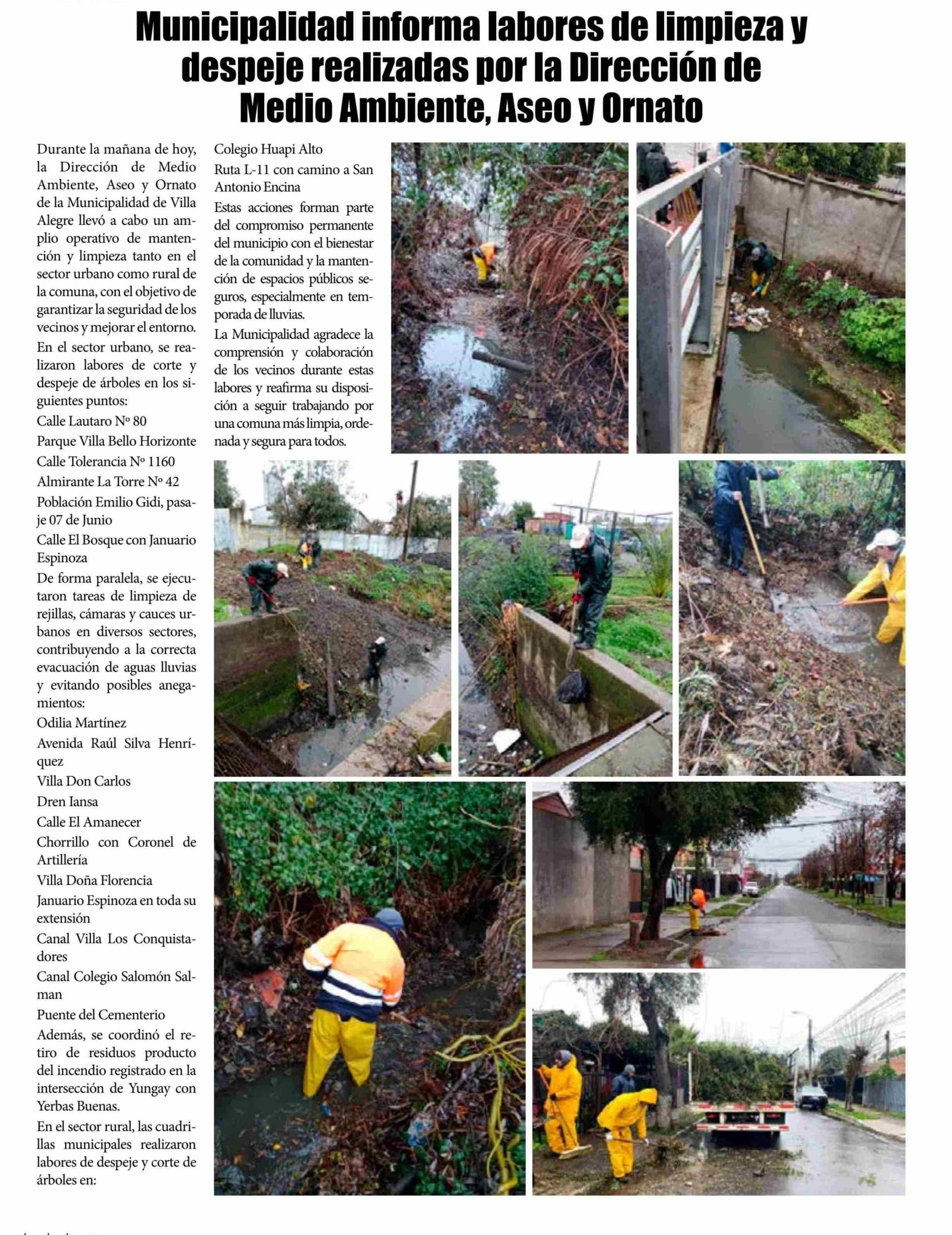 Municipalidad informa labores de limpieza y despeje realizadas por la Dirección de Medio Ambiente, Aseo y Ornato