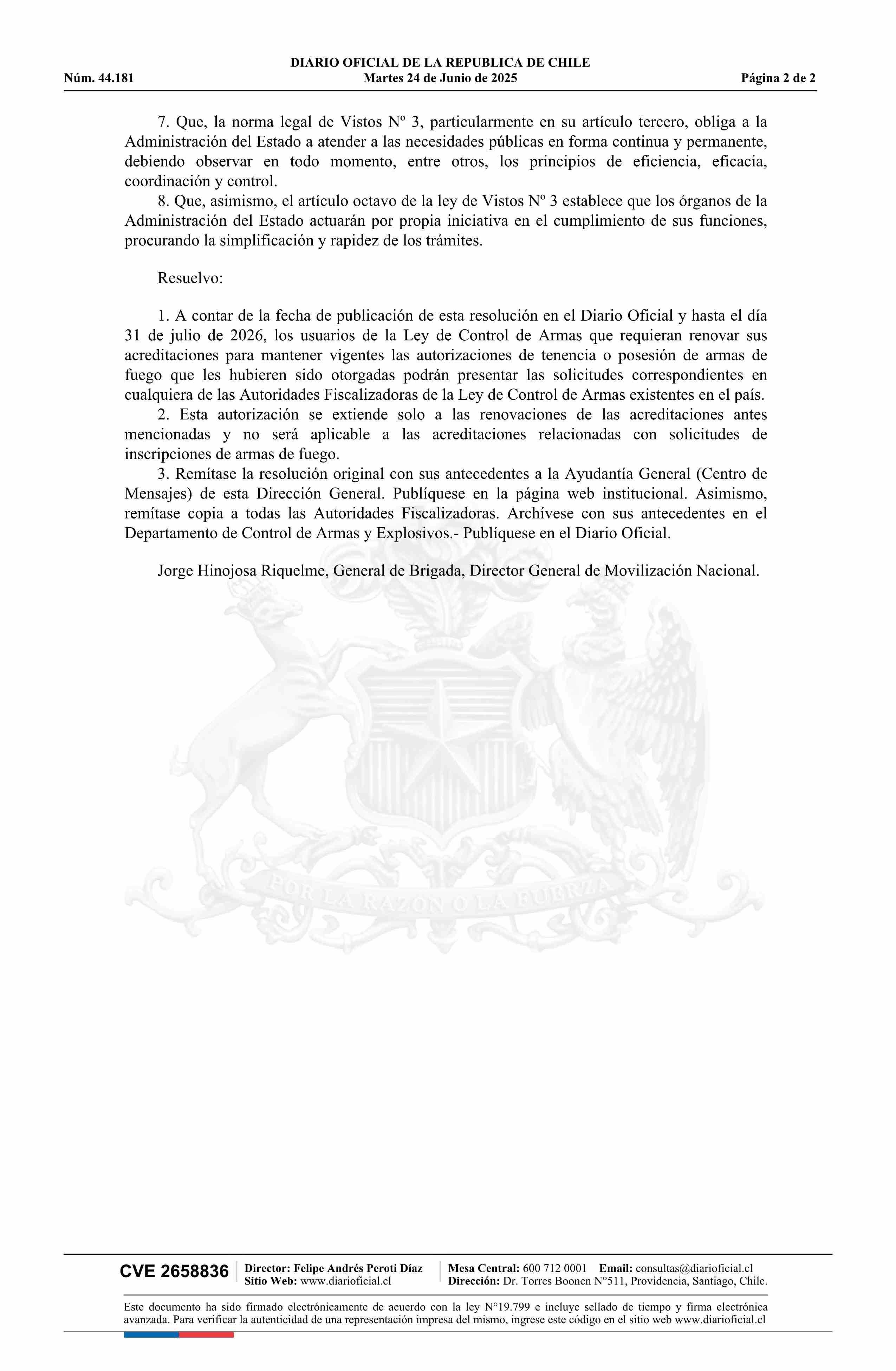 | Título: | Resolución exenta número 1.521, de 2025.- Establece disposiciones sobre acreditación cada cinco años del cumplimiento de requisitos para mantener vigentes autorizaciones de tenencia o posesión de armas de fuego |