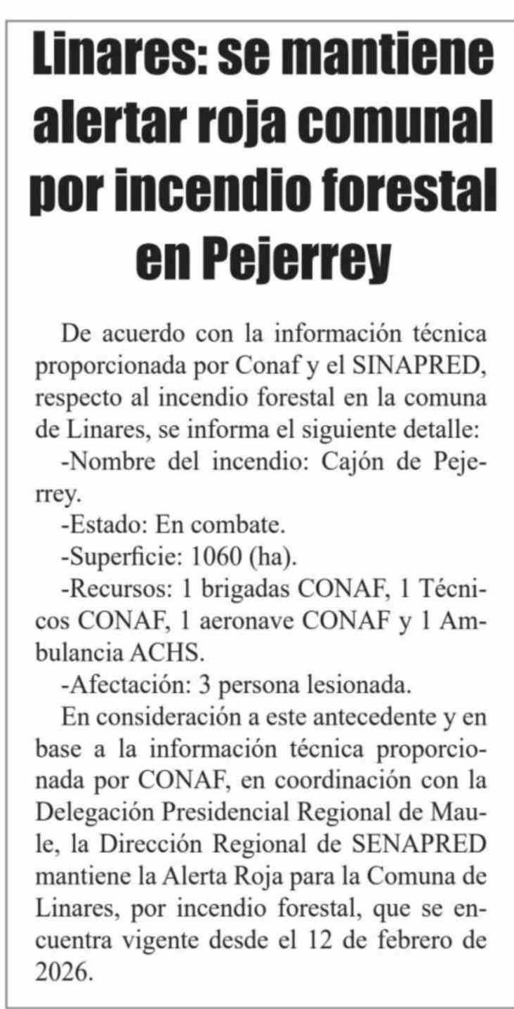 Linares: se mantiene alertar roja comunal por incendio forestal en Pejerrey