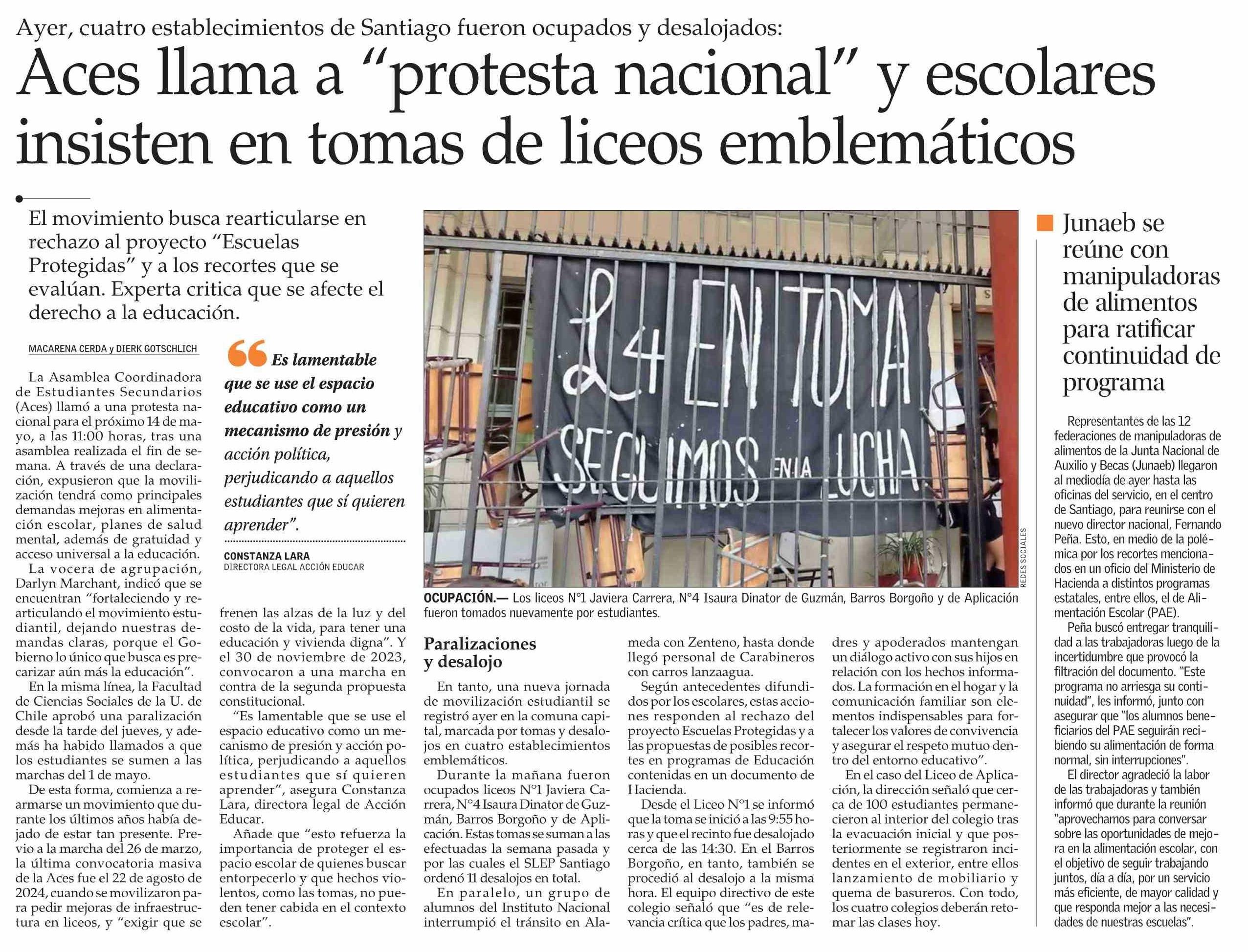 Título: Aces llama a “protesta nacional” y escolares insisten en tomas de liceos emblemáticos