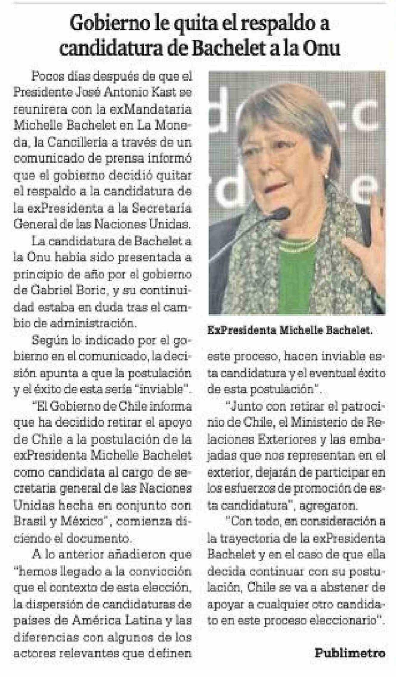 Gobierno le quita el respaldo a candidatura de Bachelet a la Onu