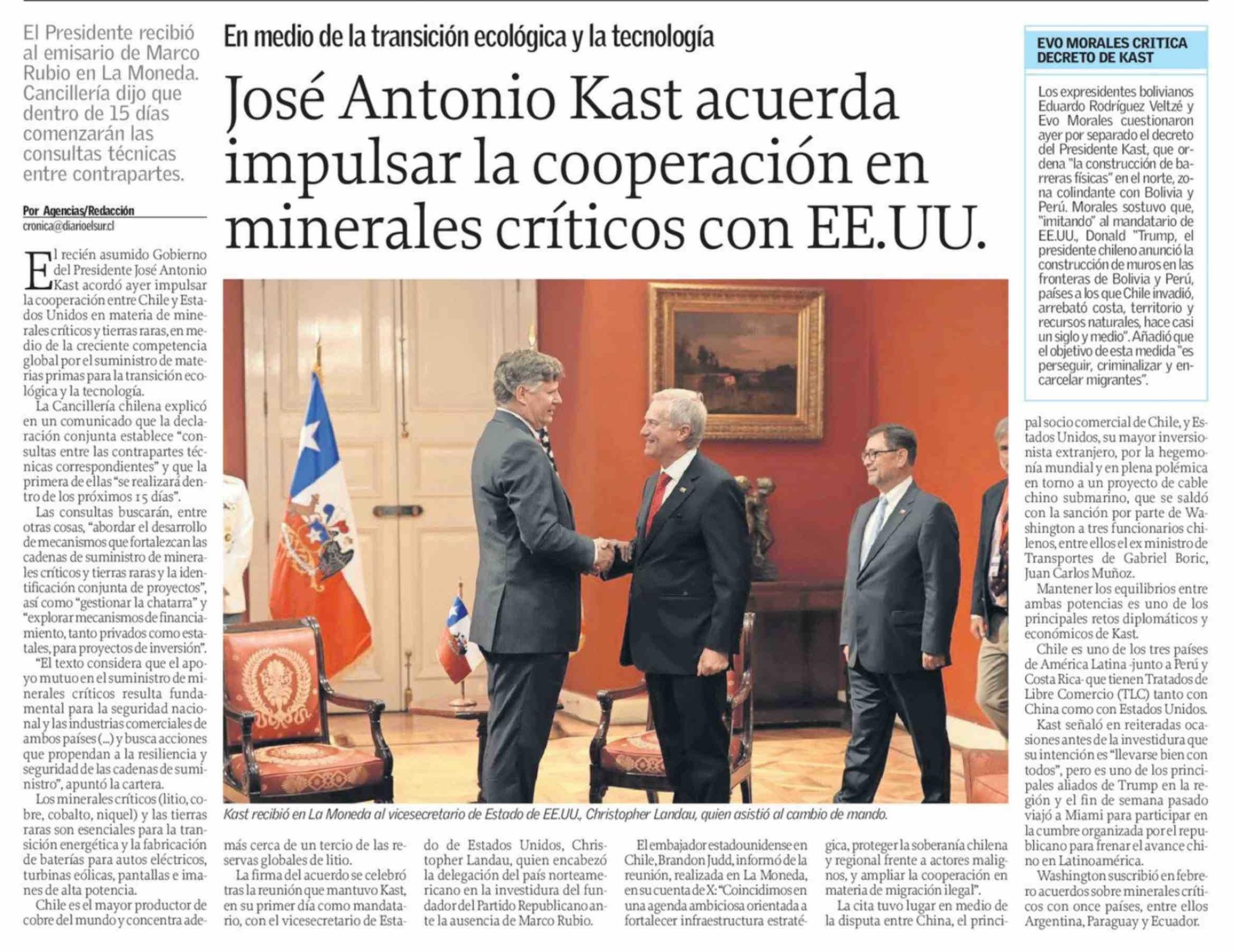 José Antonio Kast acuerda impulsar la cooperación en minerales críticos con EE.UU.