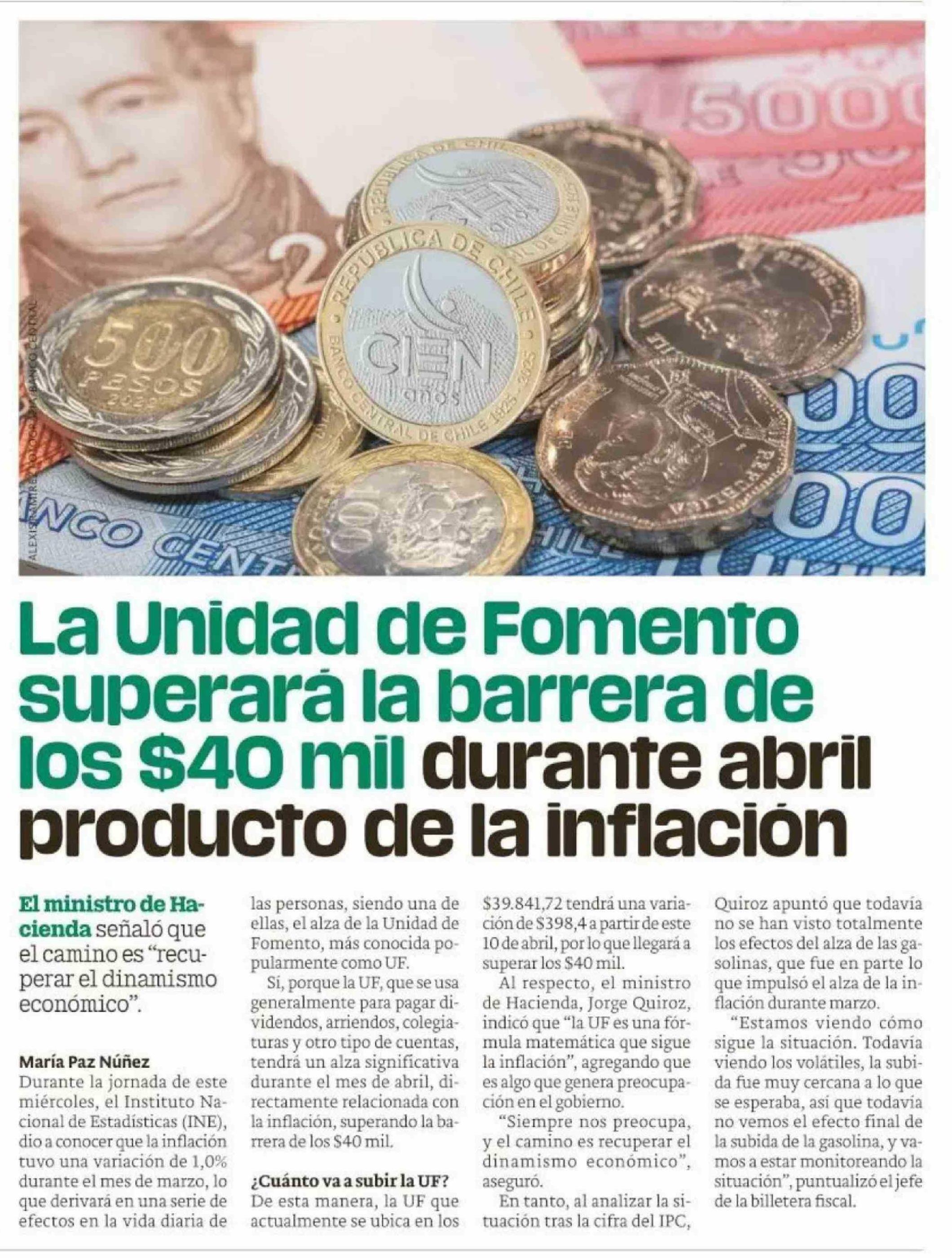 La Unidad de Fomento superara la barrera de los $40 mil durante abril producto de la inflación