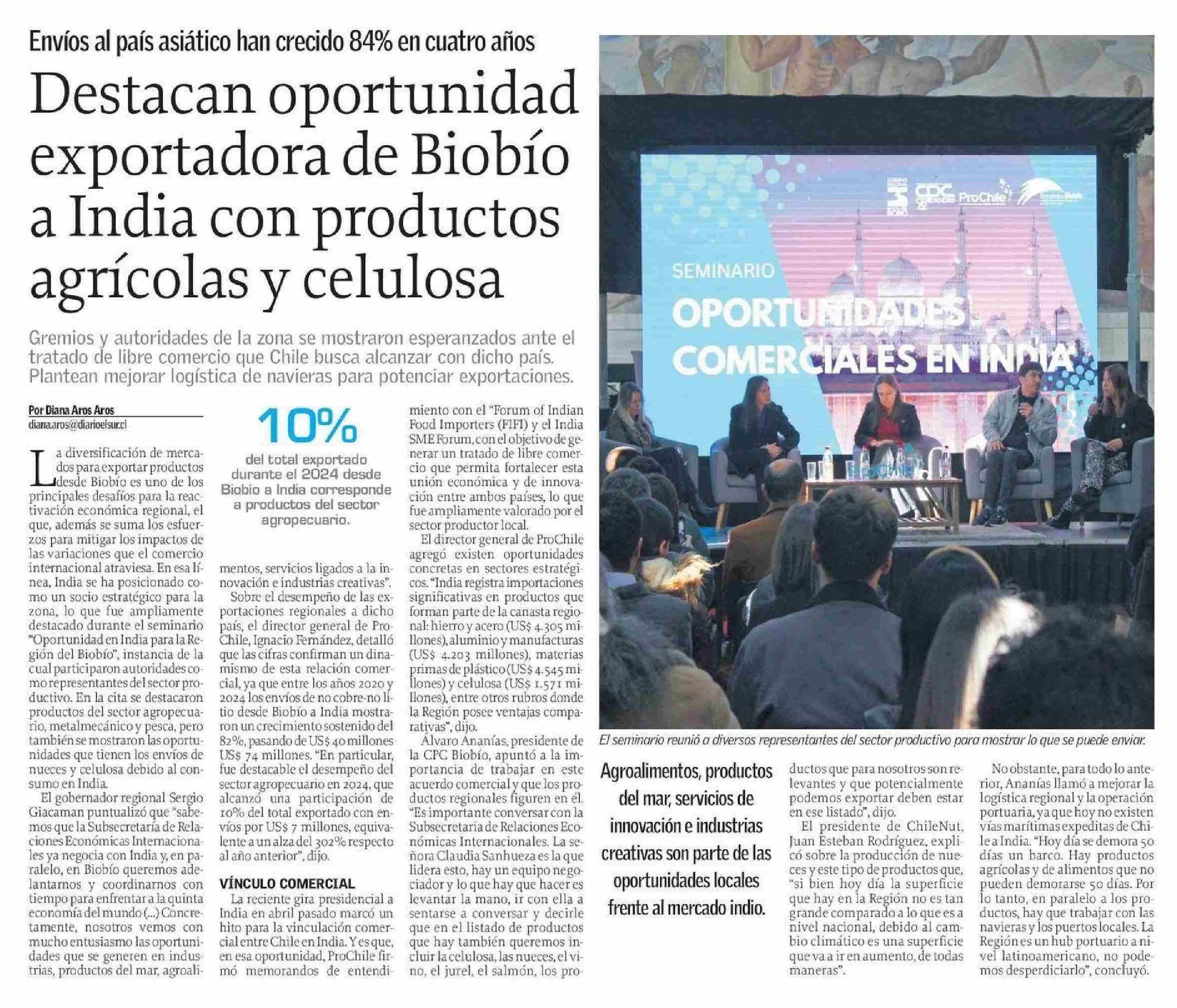 Destacan oportunidad exportadora de Biobío a India con productos agrícolas y celulosa