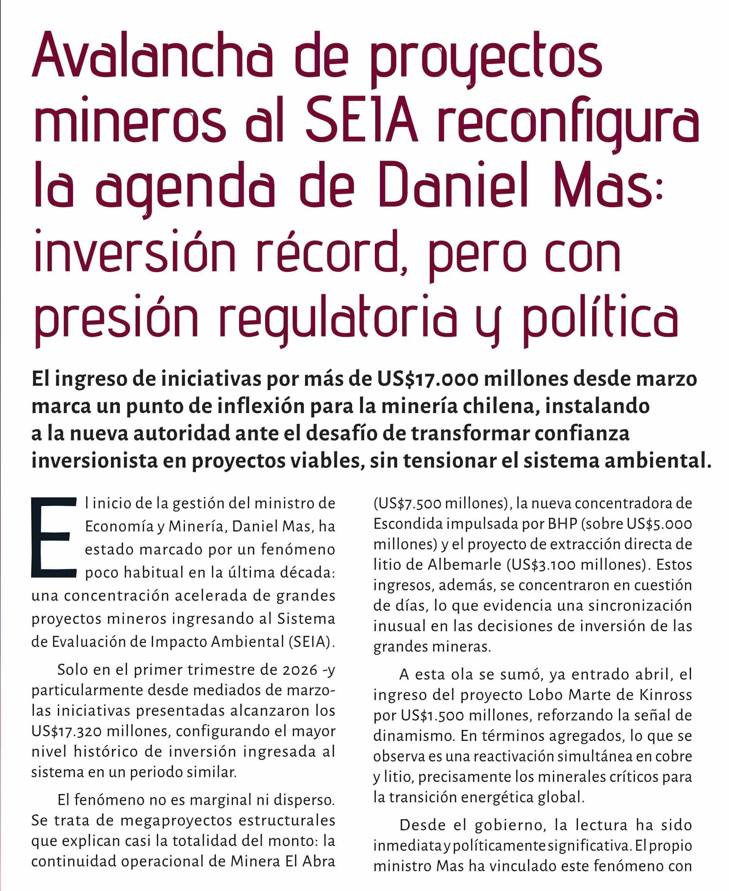 Avalancha de proyectos mineros al SElA reconfigura la agenda de Daniel Mas: inversión récord, pero con presión regulatoria y política