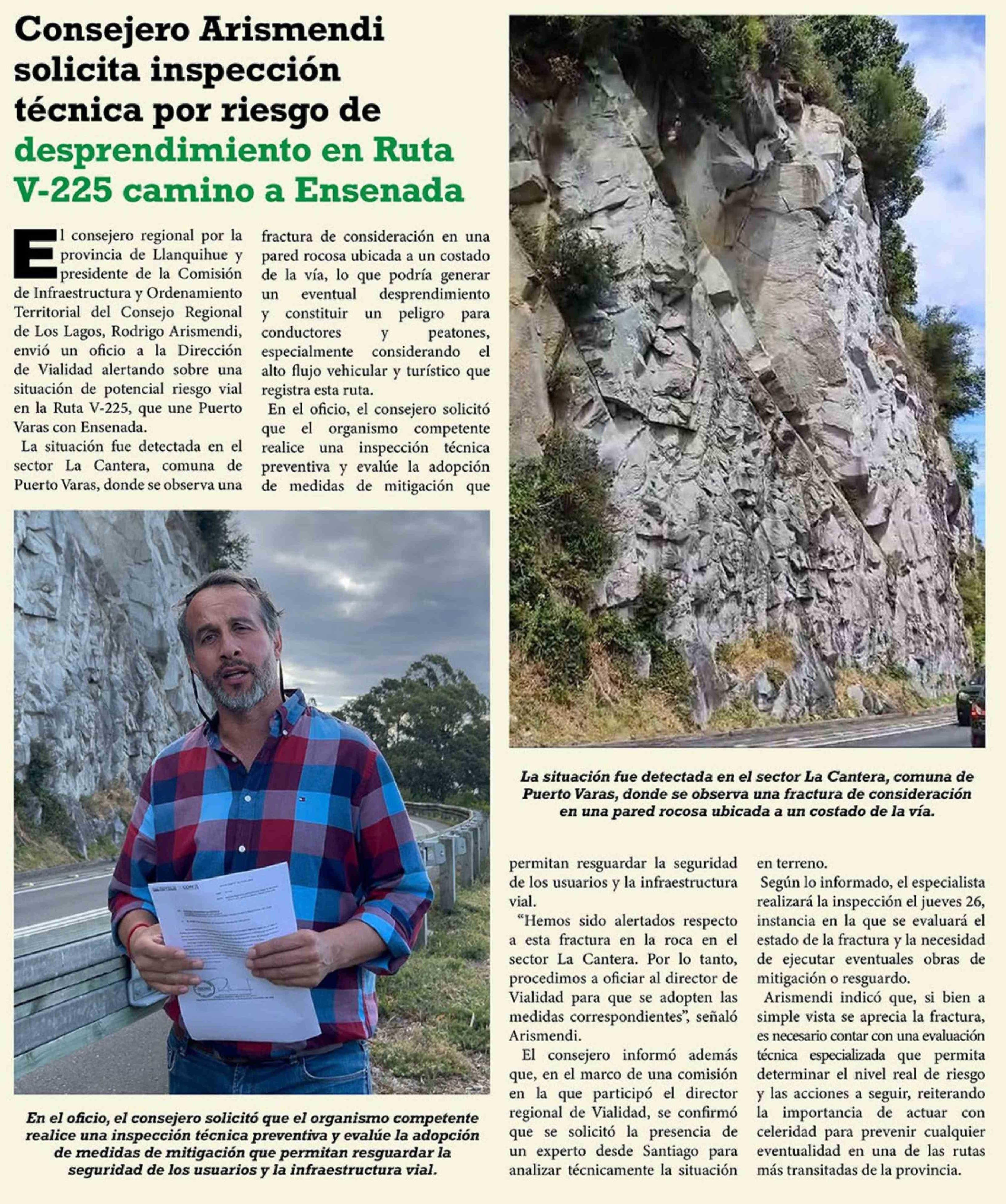 Consejero Arismendi solicita inspección técnica por riesgo de desprendimiento en Ruta V-225 camino a Ensenada