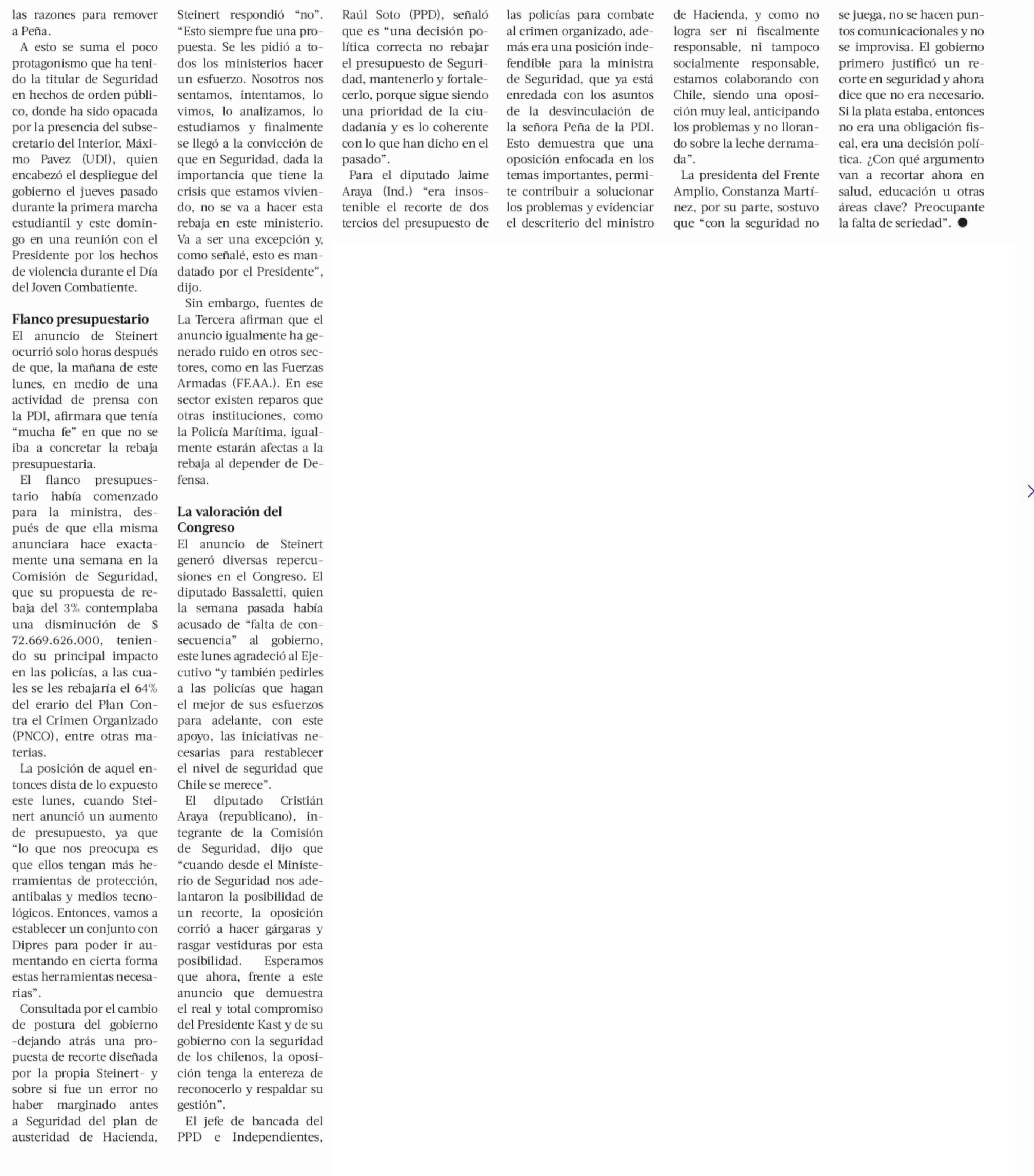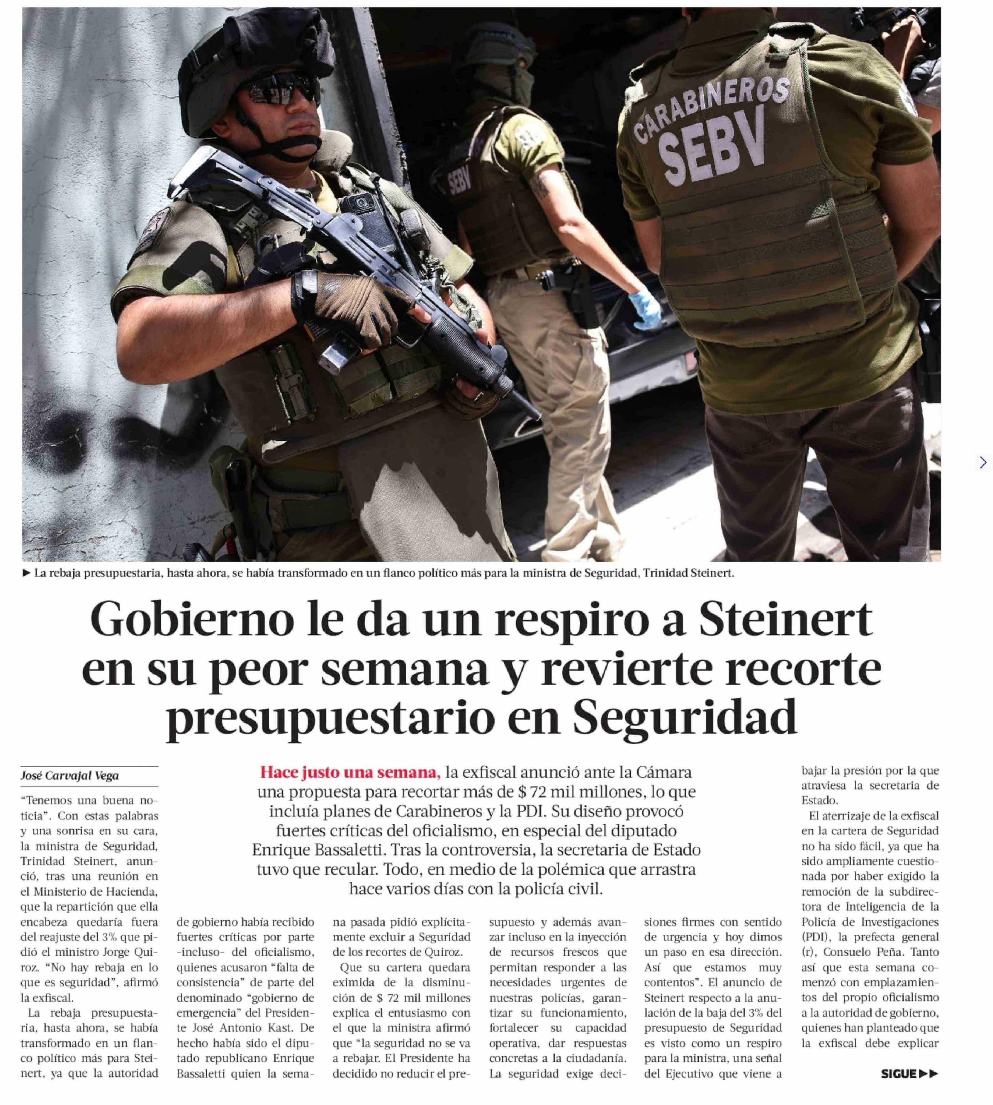 Gobierno le da un respiro a Steinert en su peor semana y revierte recorte presupuestario en Seguridad