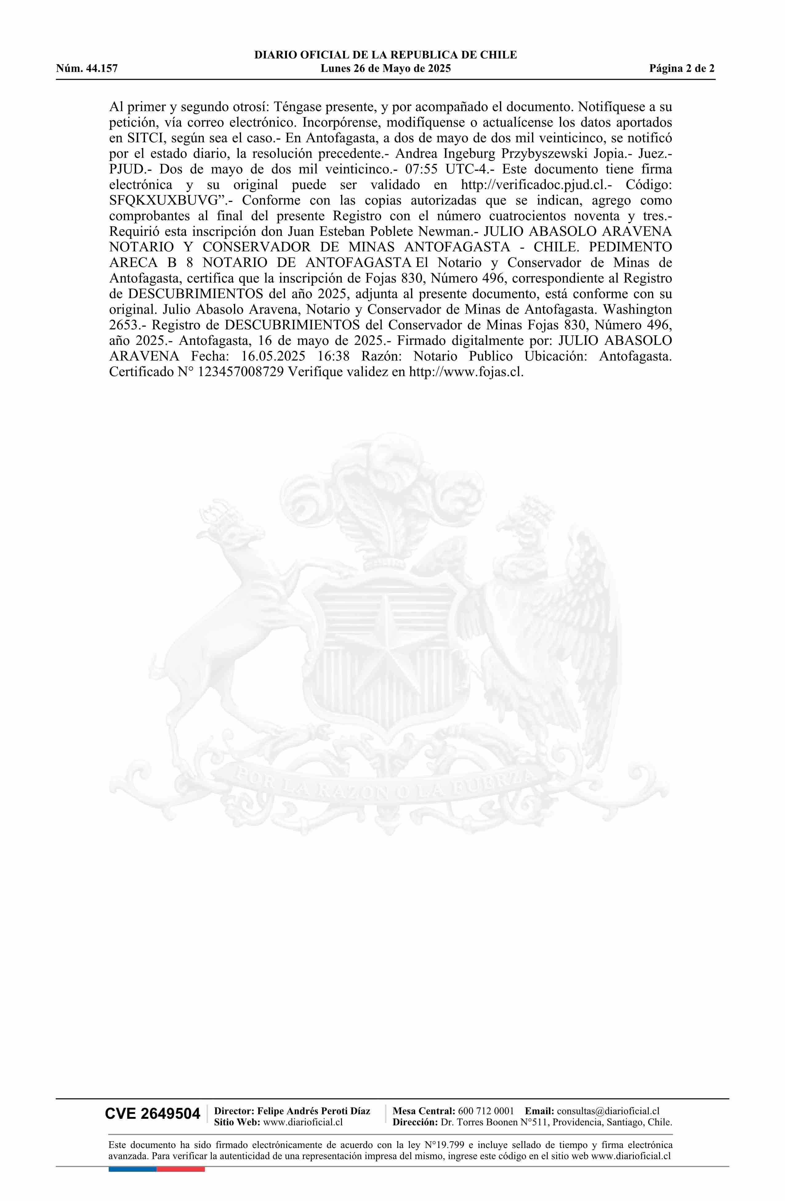 DIARIO OFICIAL CHILE - BOLETÍN OFICIAL DE MINERÍA (DIARIO OFICIAL CHILE – BOM – PEDIMENTOS MINEROS)
