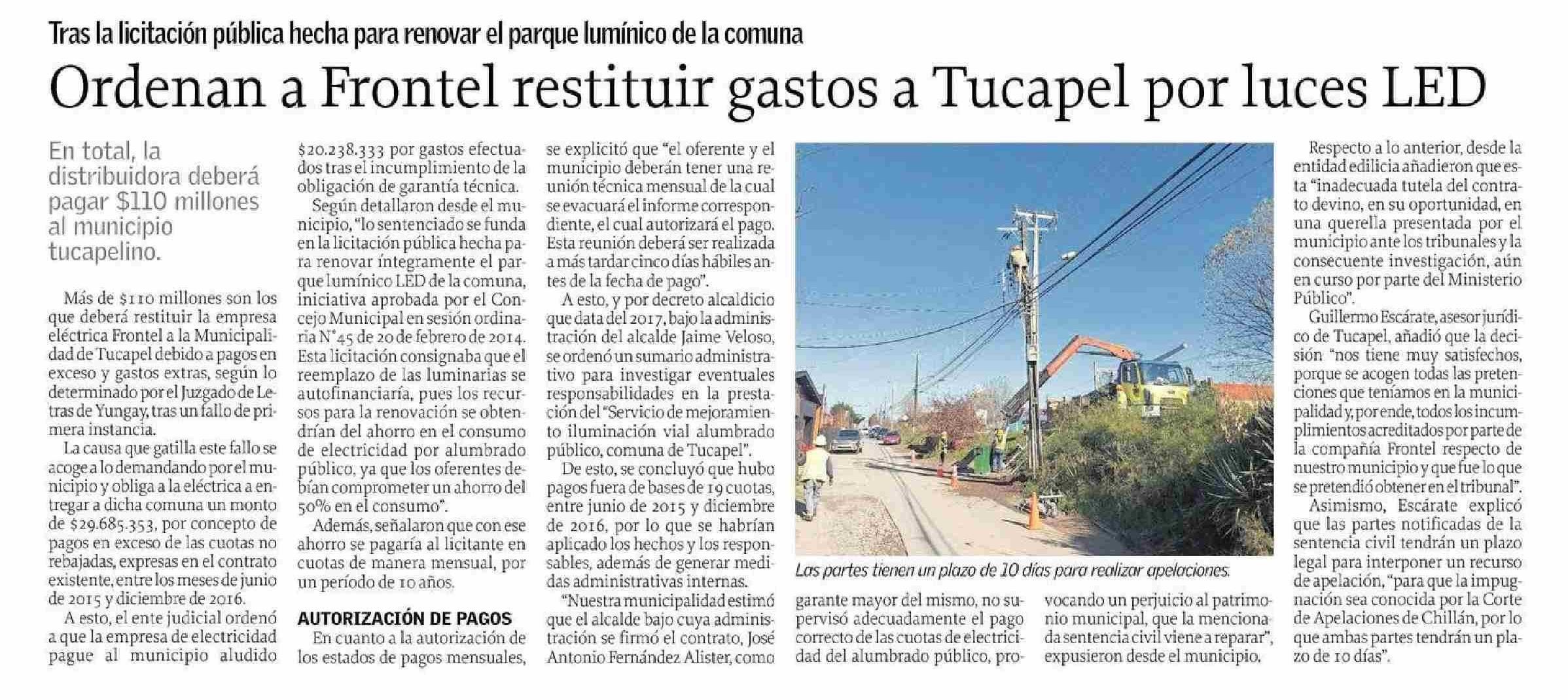 Ordenan a Frontel restituir gastos a Tucapel por luces LED