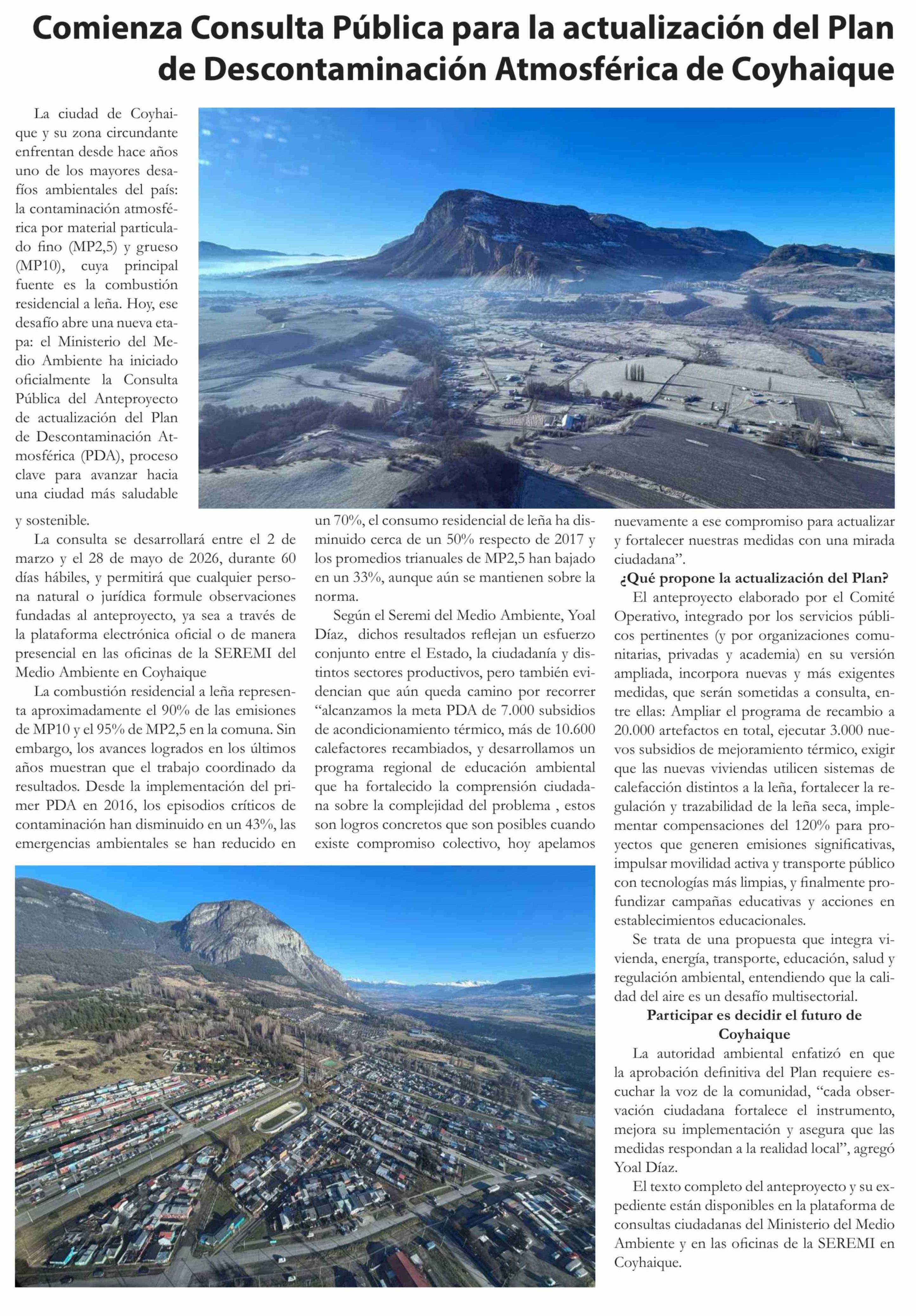 Comienza Consulta Pública para la actualización del Plan de Descontaminación Atmosférica de Coyhaique