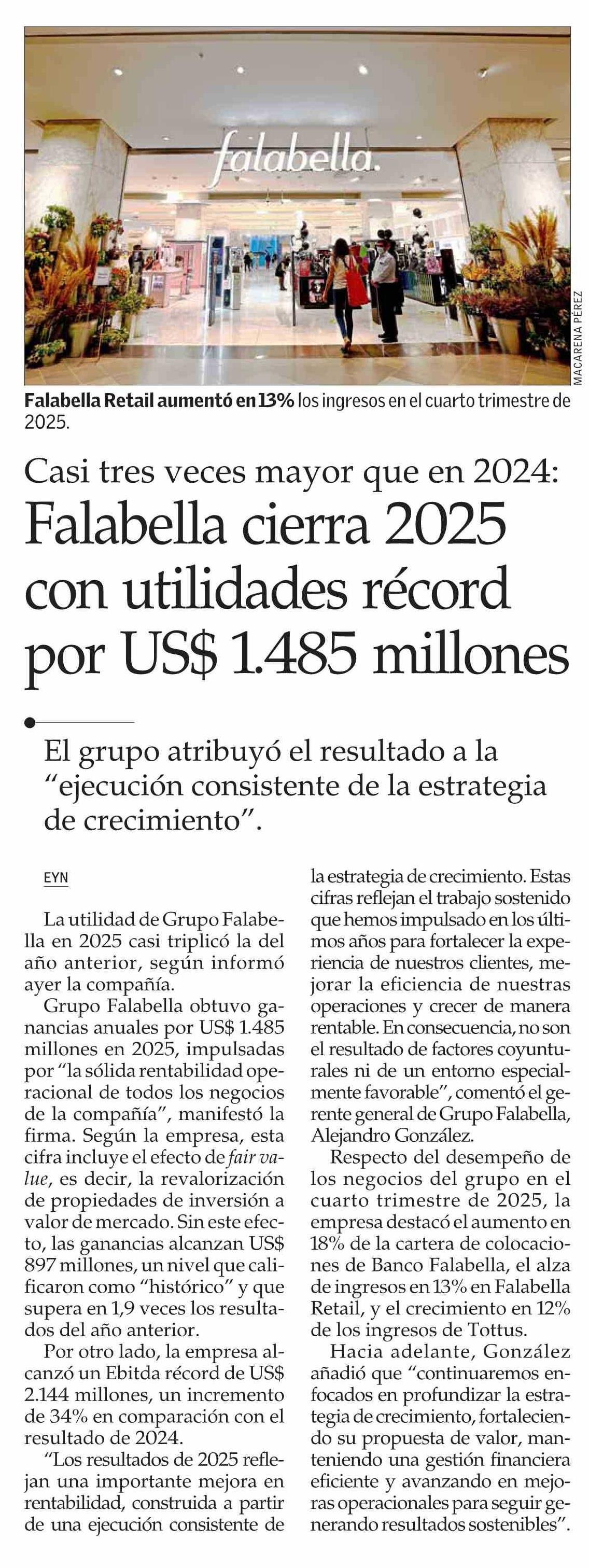 Falabella cierra 2025 con utilidades récord por US$ 1.485 millones