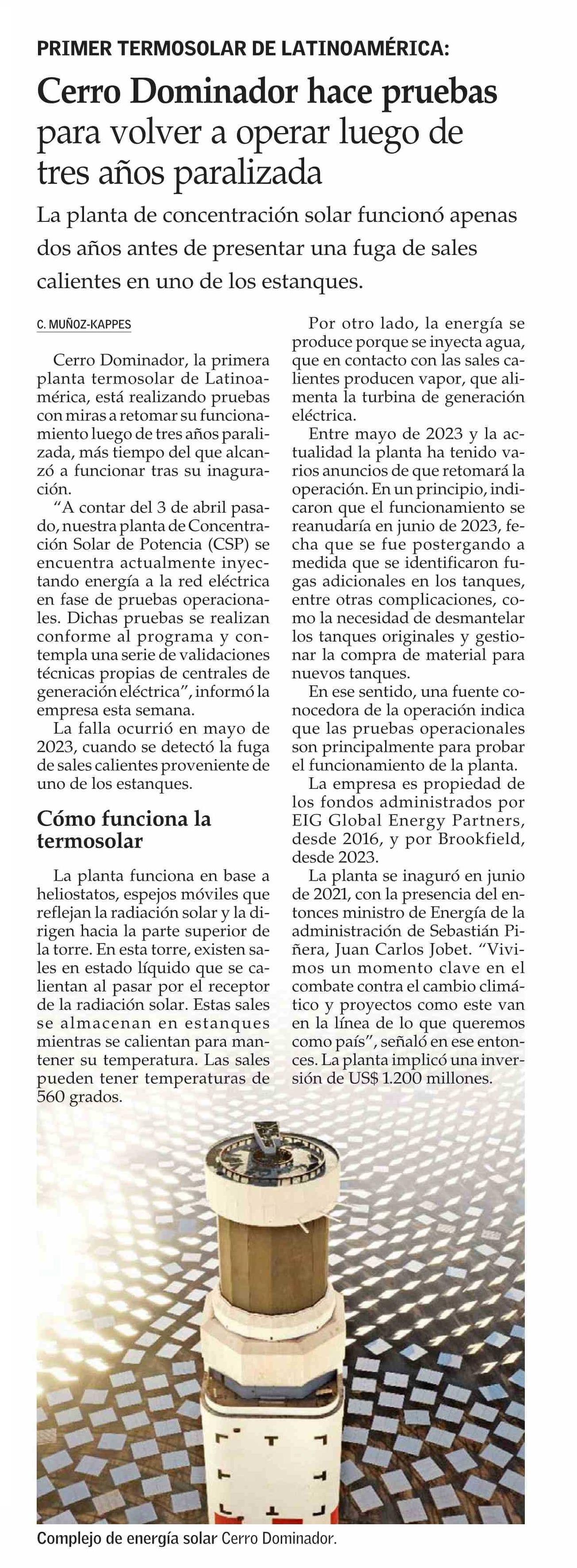Cerro Dominador hace pruebas para volver a operar luego de tres años paralizada
