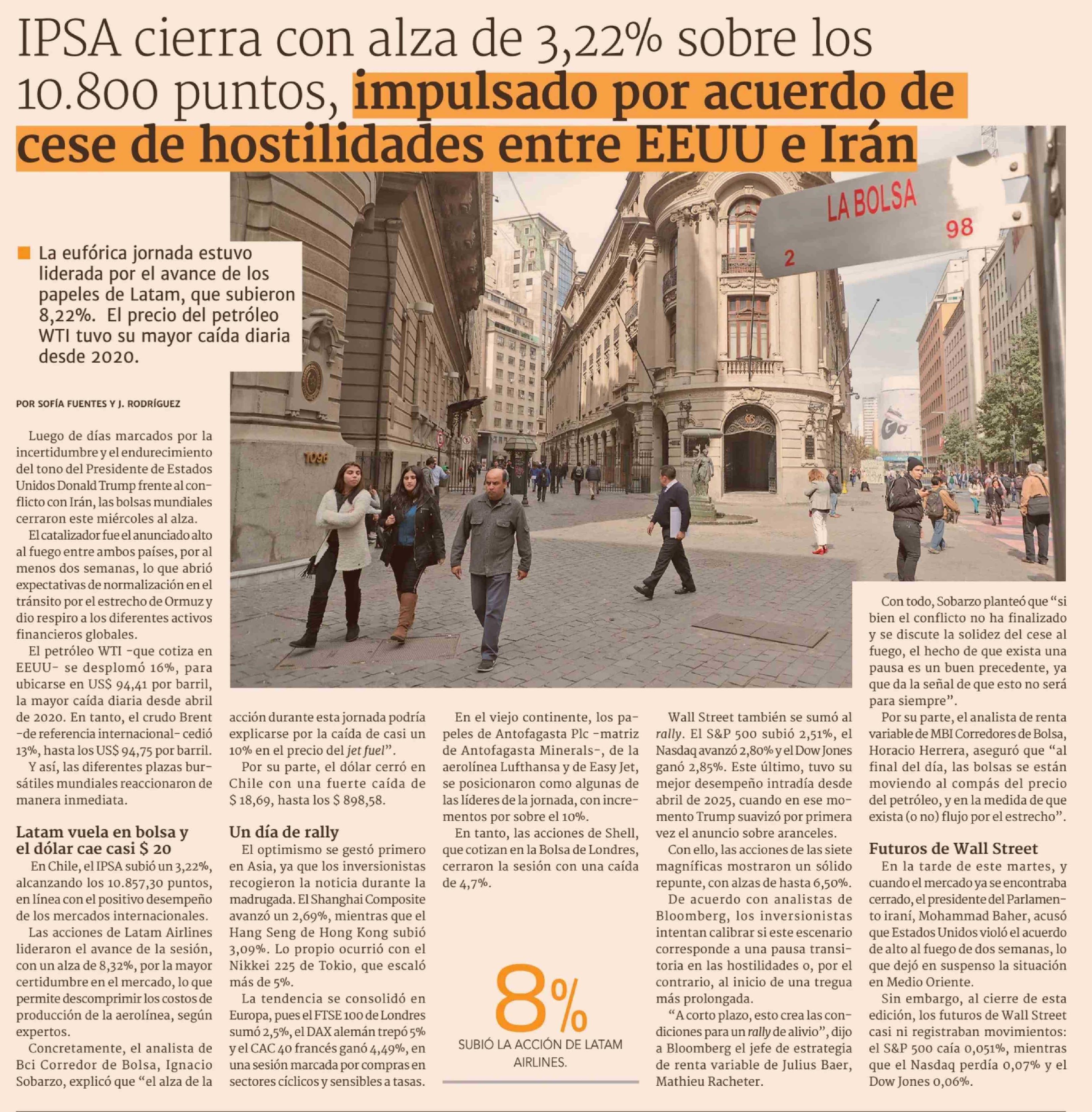 IPSA cierra con alza de 3,22% sobre los 10.800 puntos, impulsado por acuerdo de cese de hostilidades entre EEUU e Irán