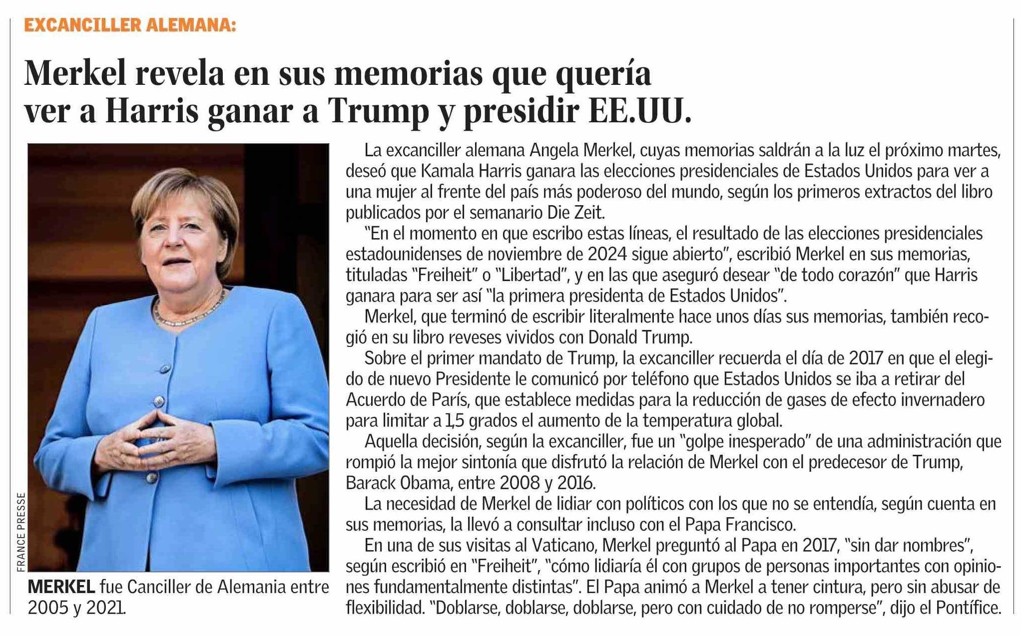 Merkel revela en sus memorias que quería ver a Harris ganar a Trump y presidir EE.UU.