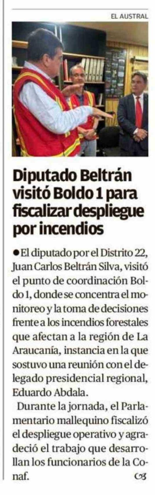 Diputado Beltrán visitó Boldo 1 para fiscalizar despliegue por incendios