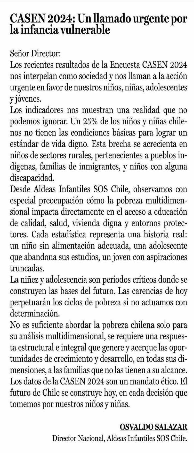 Cartas: La infancia vulnerable CASEN 2024: Un llamado urgente por la infancia vulnerable