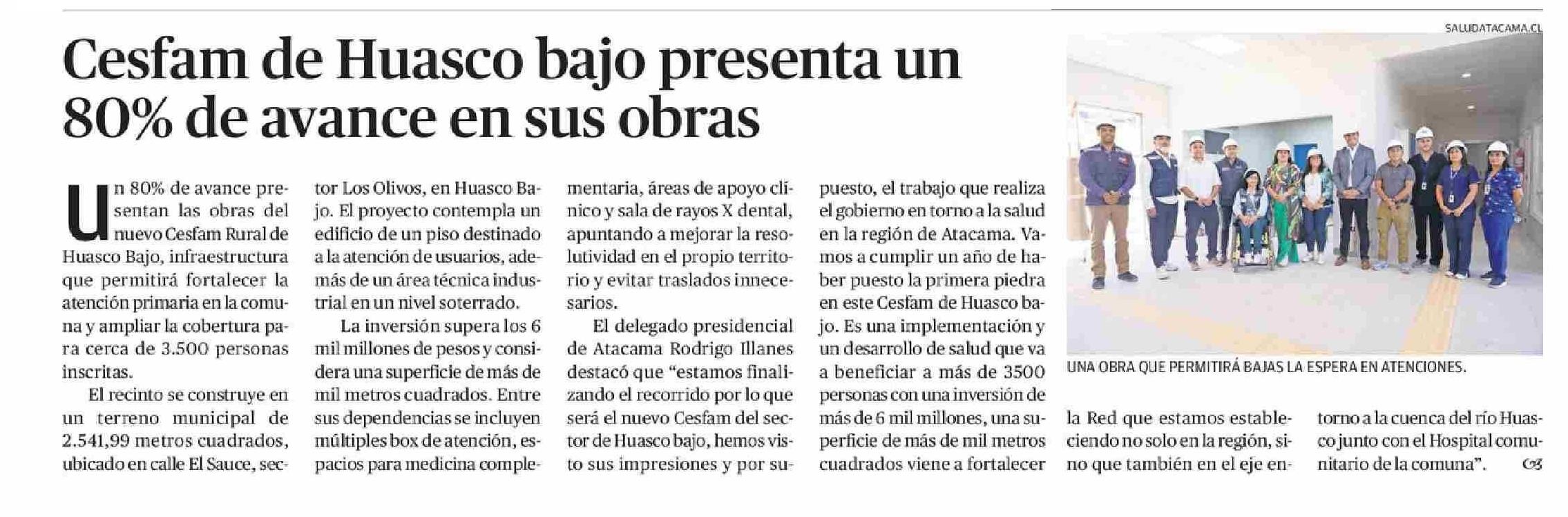 Cesfam de Huasco bajo presenta un 80% de avance en sus obras