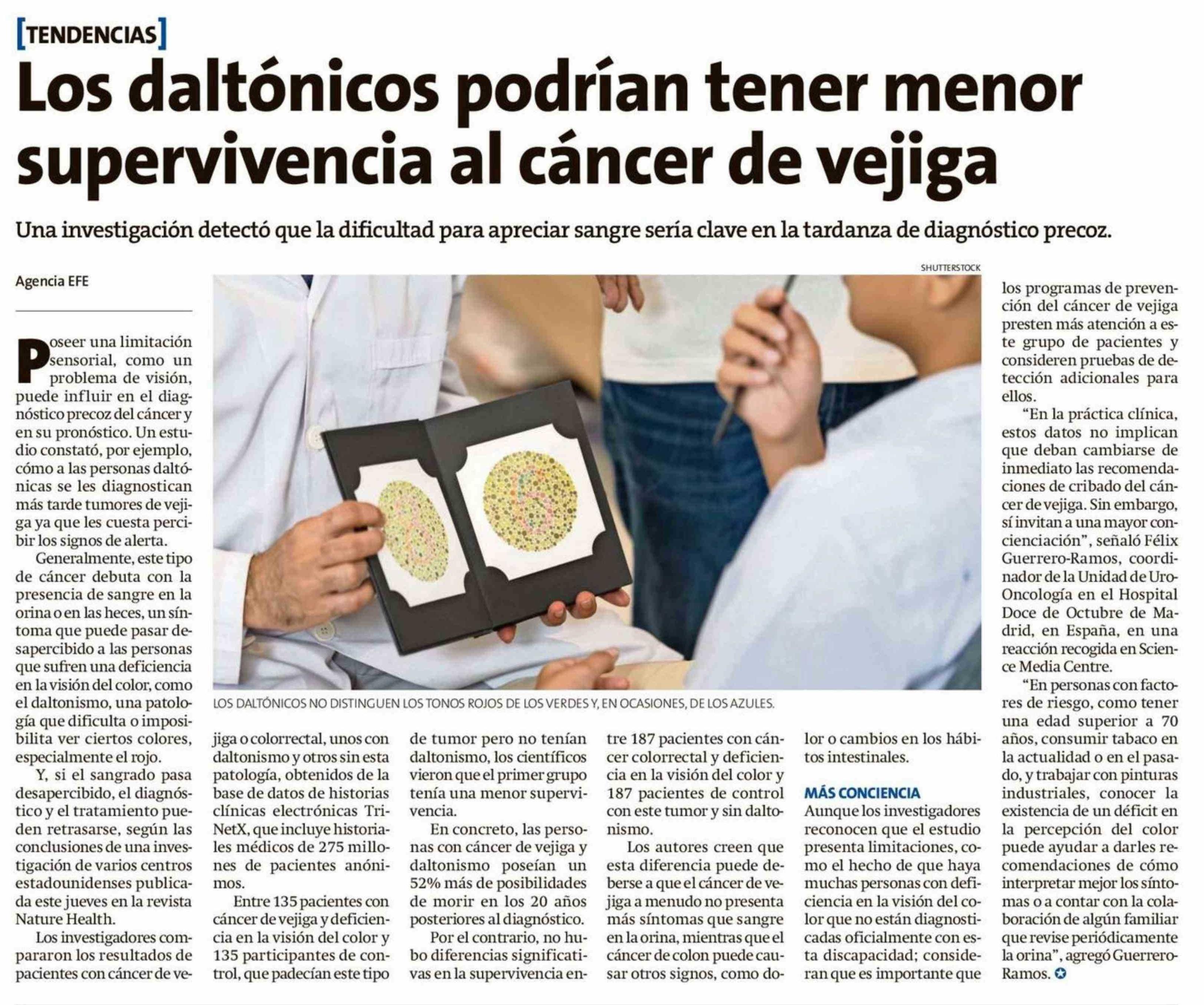 Los daltónicos podrían tener menor supervivencia al cáncer de vejiga