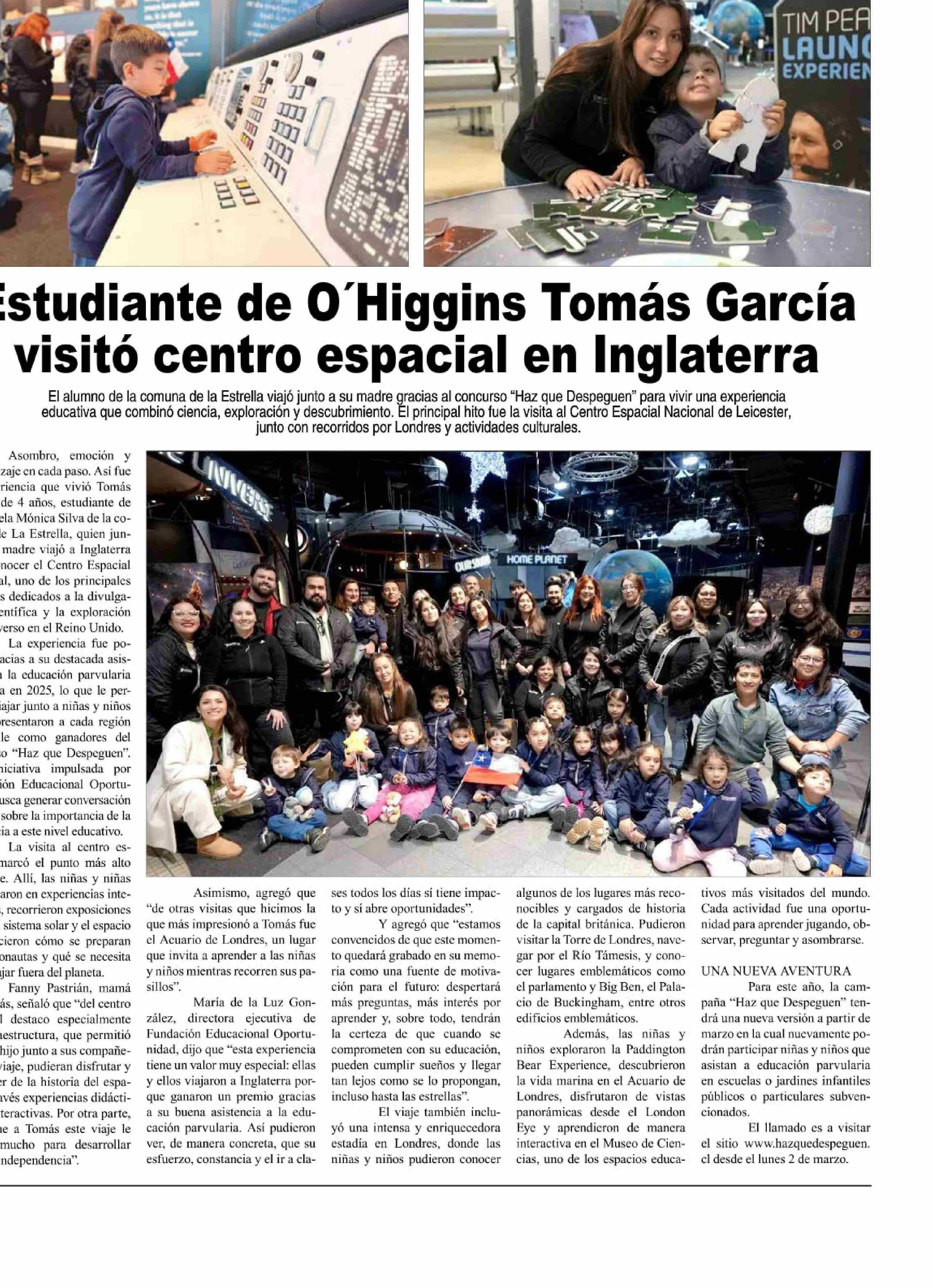 Estudiante de O'Higgins Tomás García visitó centro espacial en Inglaterra