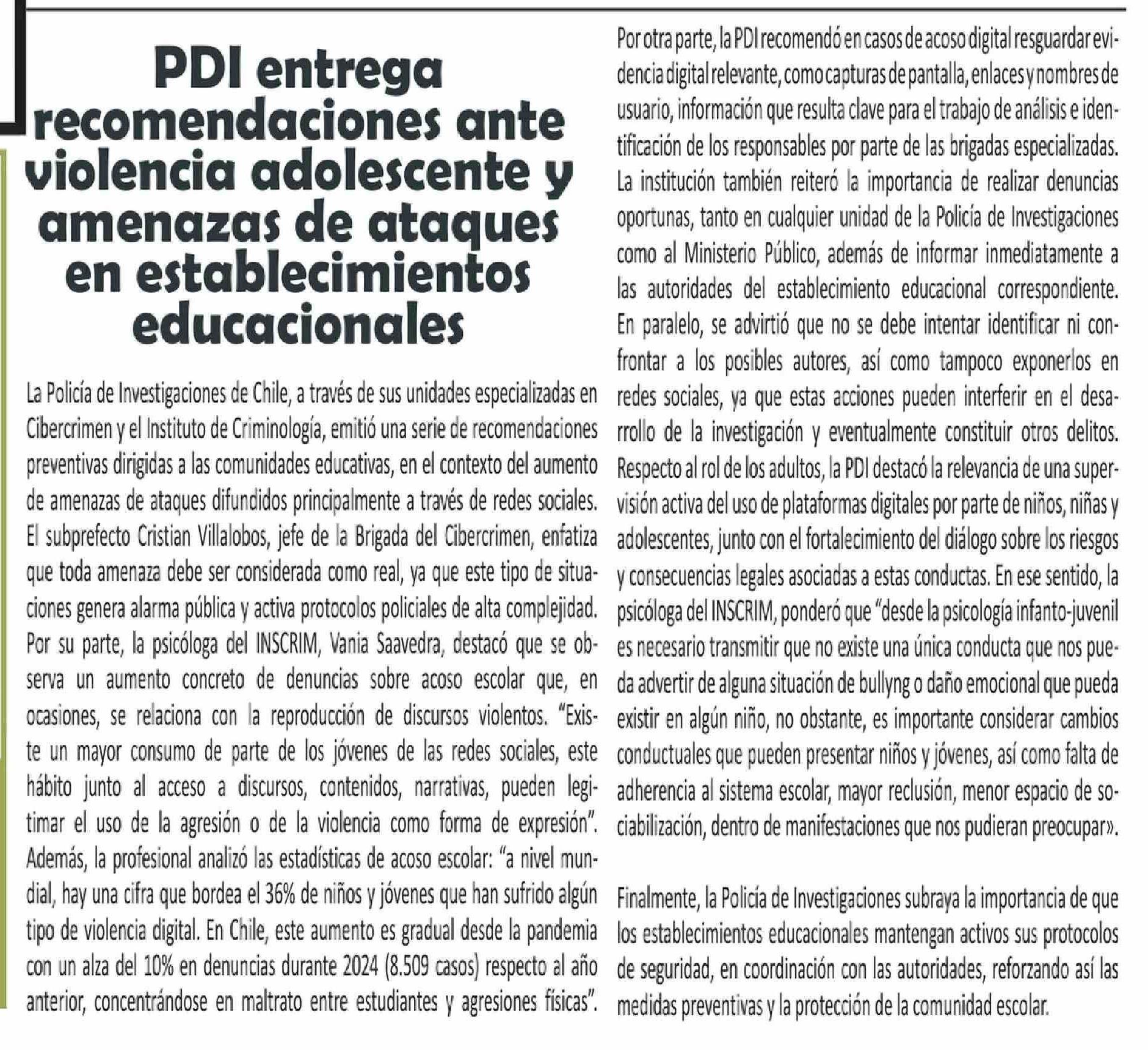PDI entrega recomendaciones ante violencia adolescente y amenazas de ataques en establecimientos educacionales