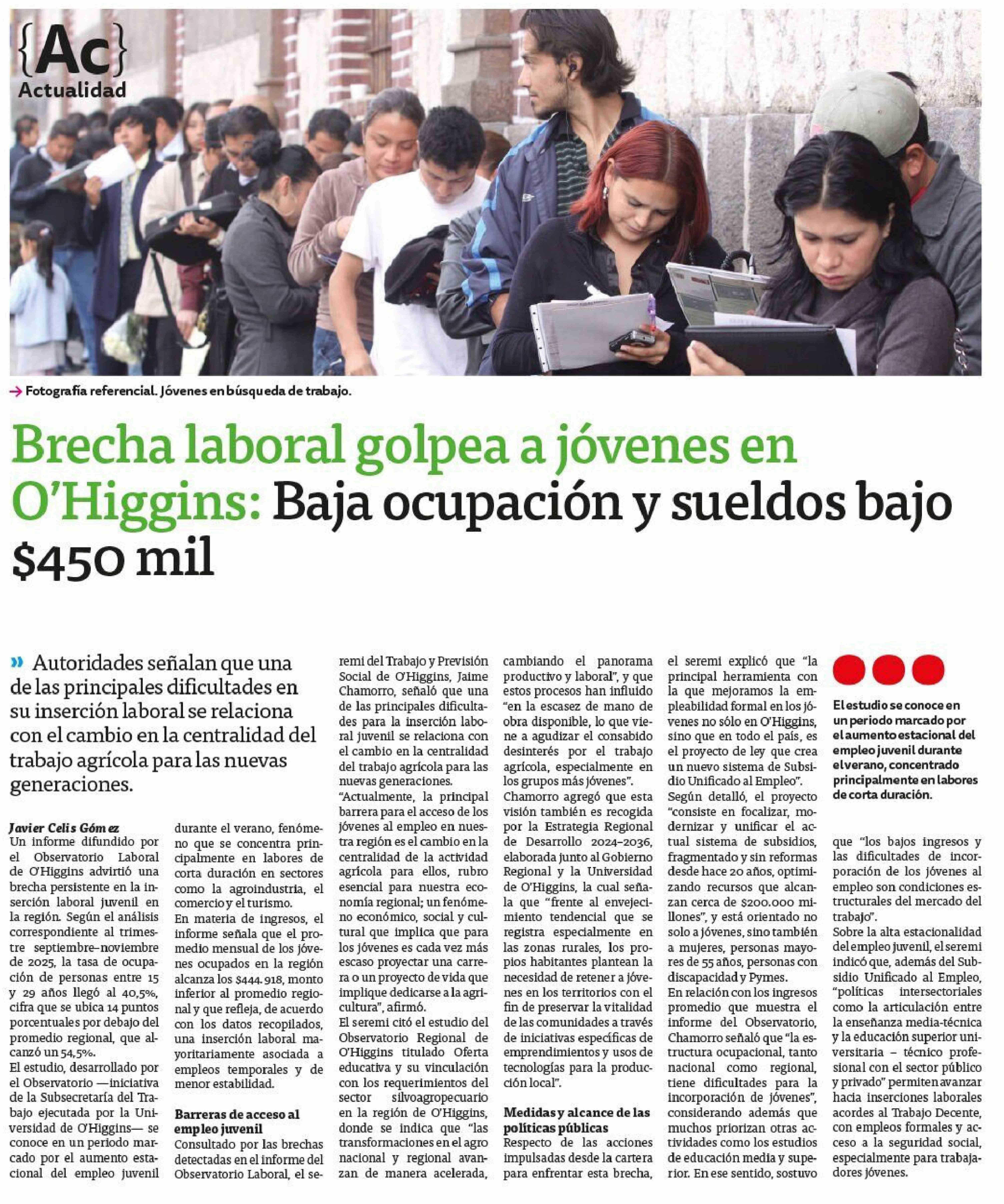 Brecha laboral golpea a jóvenes en O'Higgins: Baja ocupación y sueldos bajo $450 mil