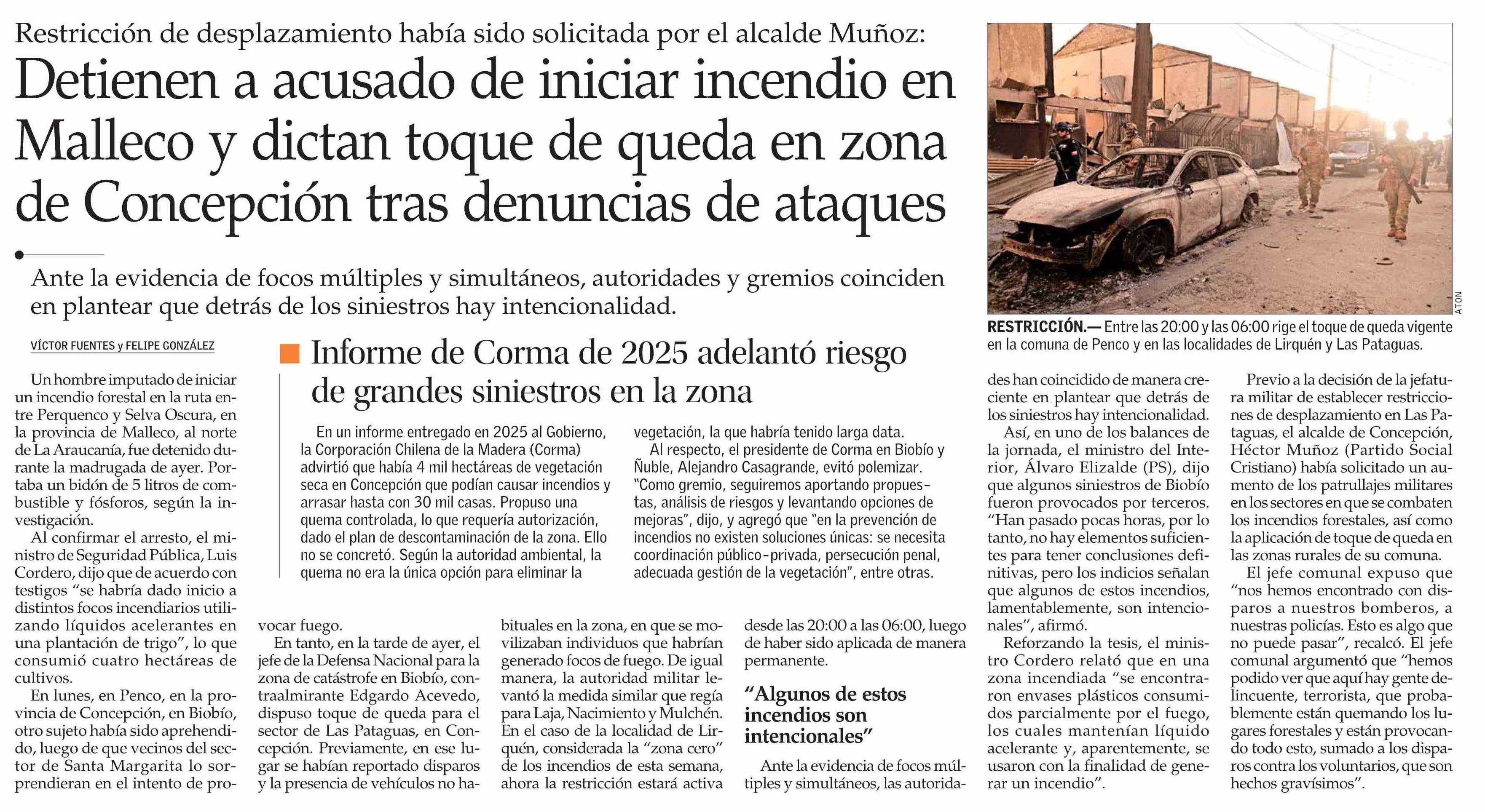 Detienen a acusado de iniciar incendio en Malleco y dictan toque de queda en zona de Concepción tras denuncias de ataques