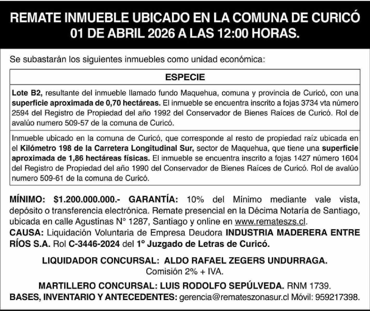 REMATE INMUEBLE UBICADO EN LA COMUNA DE CURICÓ
