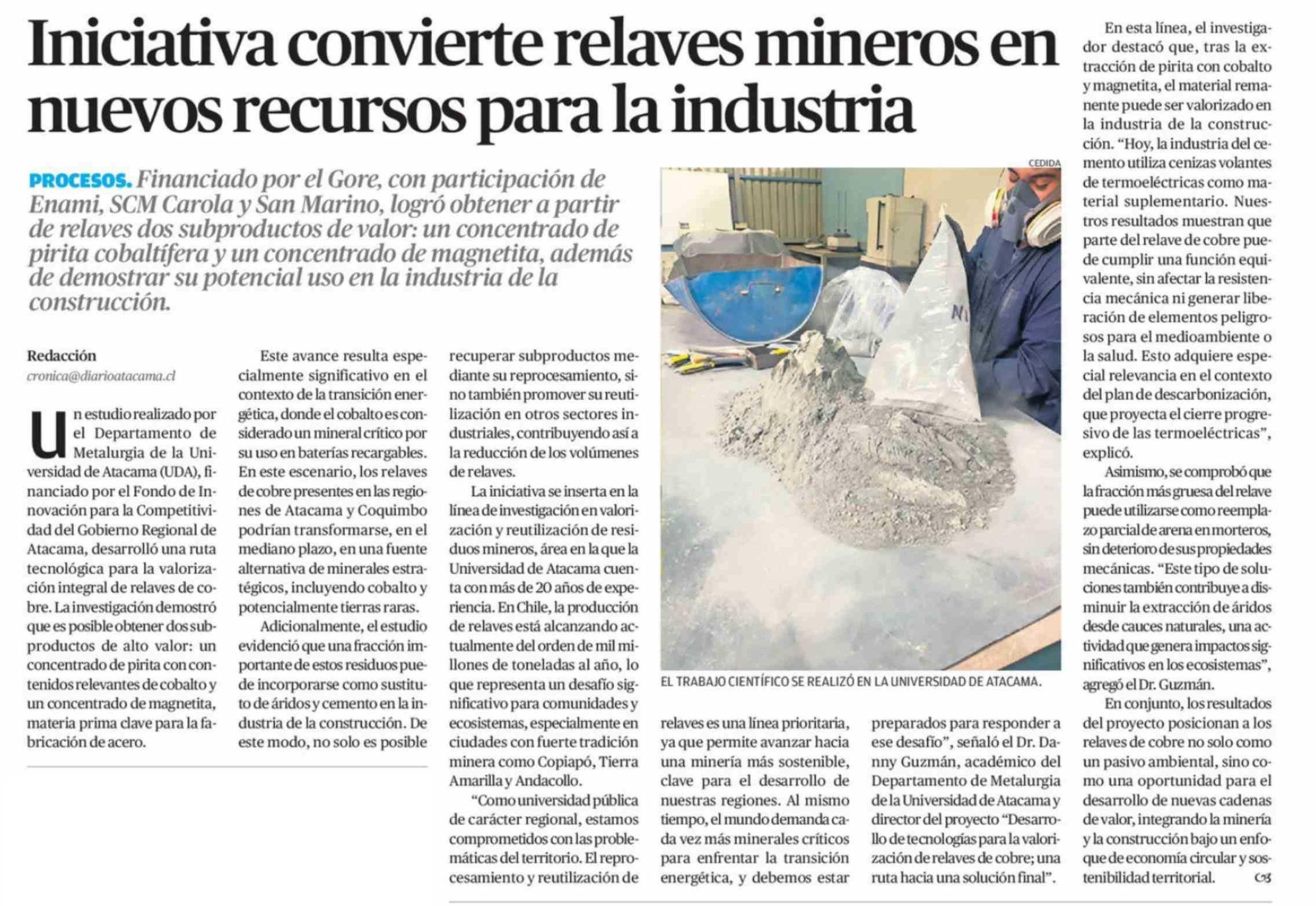Título: Iniciativa convierte relaves mineros en nuevos recursos para la industria