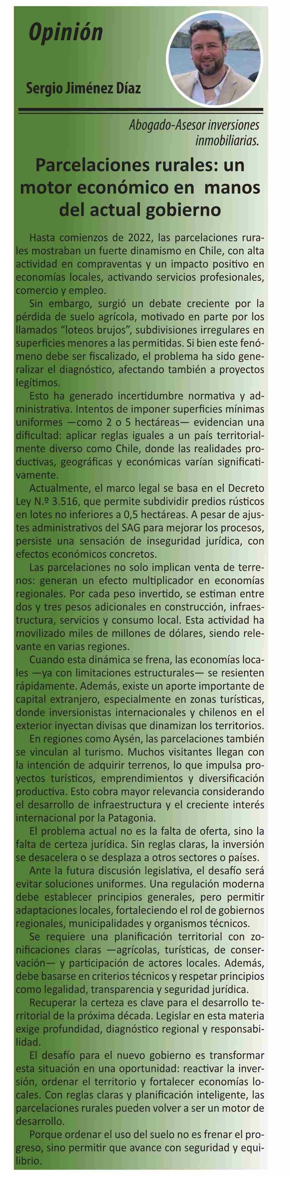 COLUMNAS DE OPINIÓN: Parcelaciones rurales- un motor económico en manos del actual gobierno