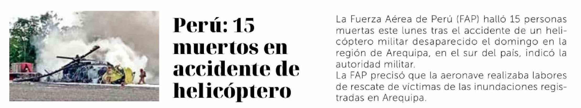 Perú: 15 muertos en accidente de helicóptero