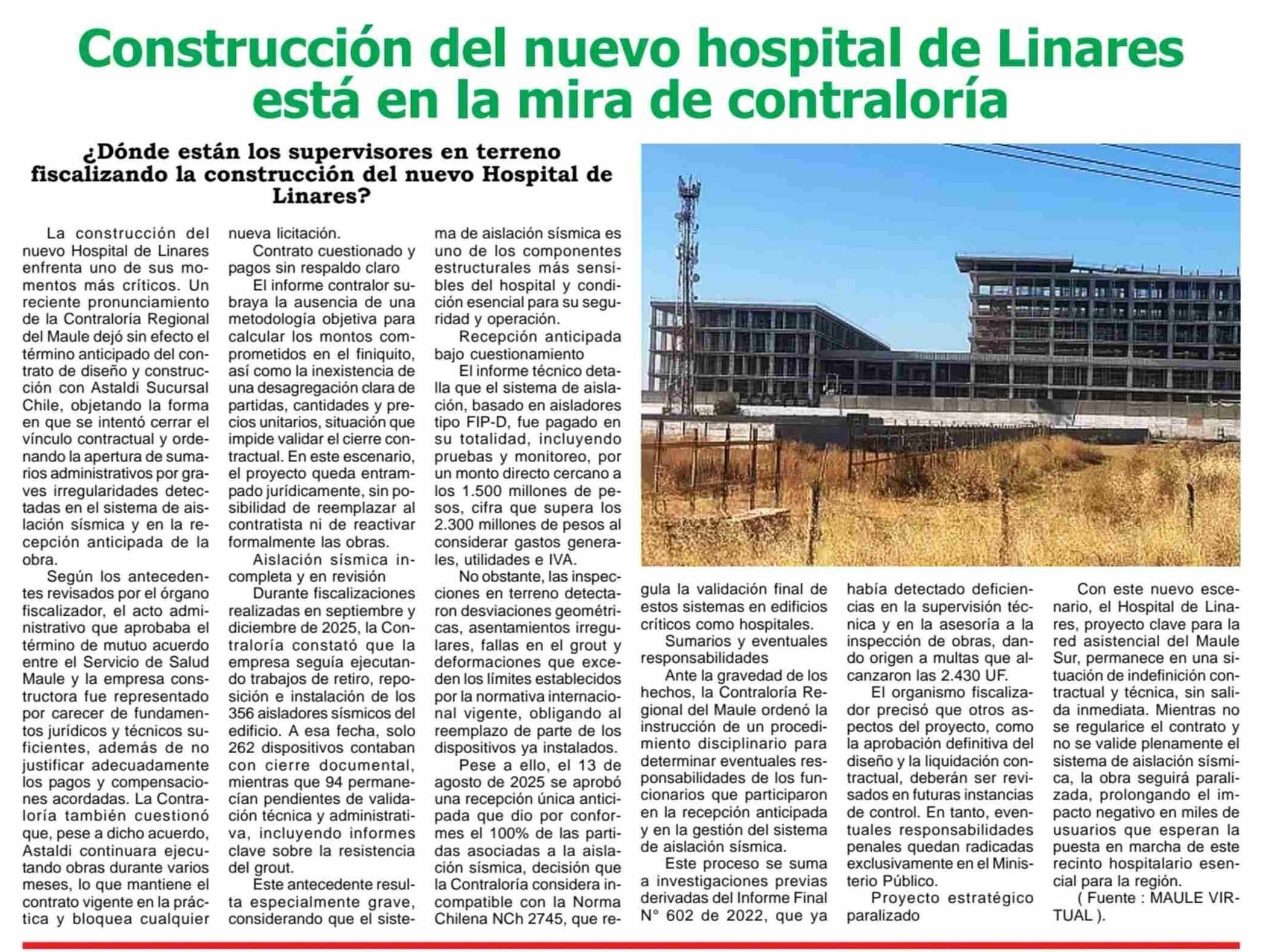 Construcción del nuevo hospital de Linares está en la mira de contraloría