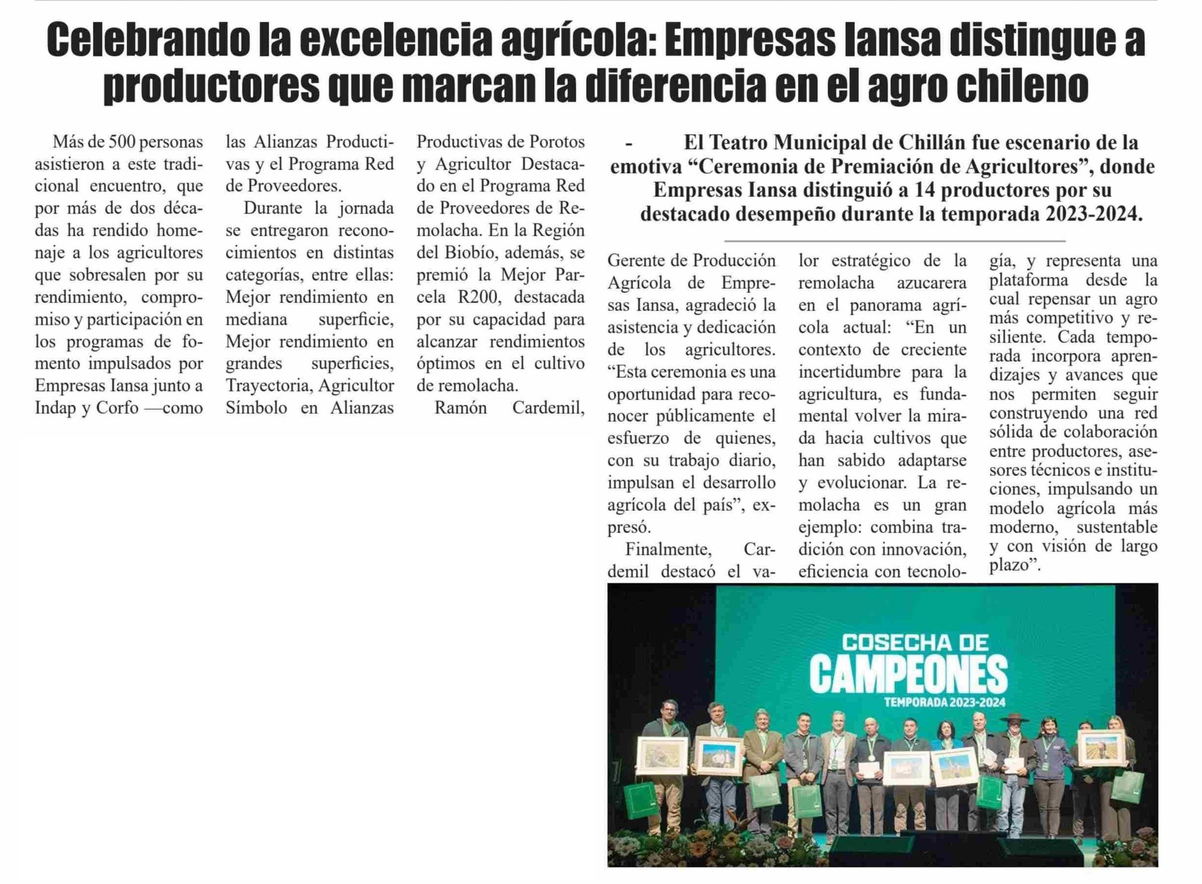 CELEBRANDO LA EXCELENCIA AGRÍCOLA: EMPRESA IANSA DISTINGUE A PRODUCTORES QUE MARCAN LA DIFERENCIA EN EL AGRO CHILENO