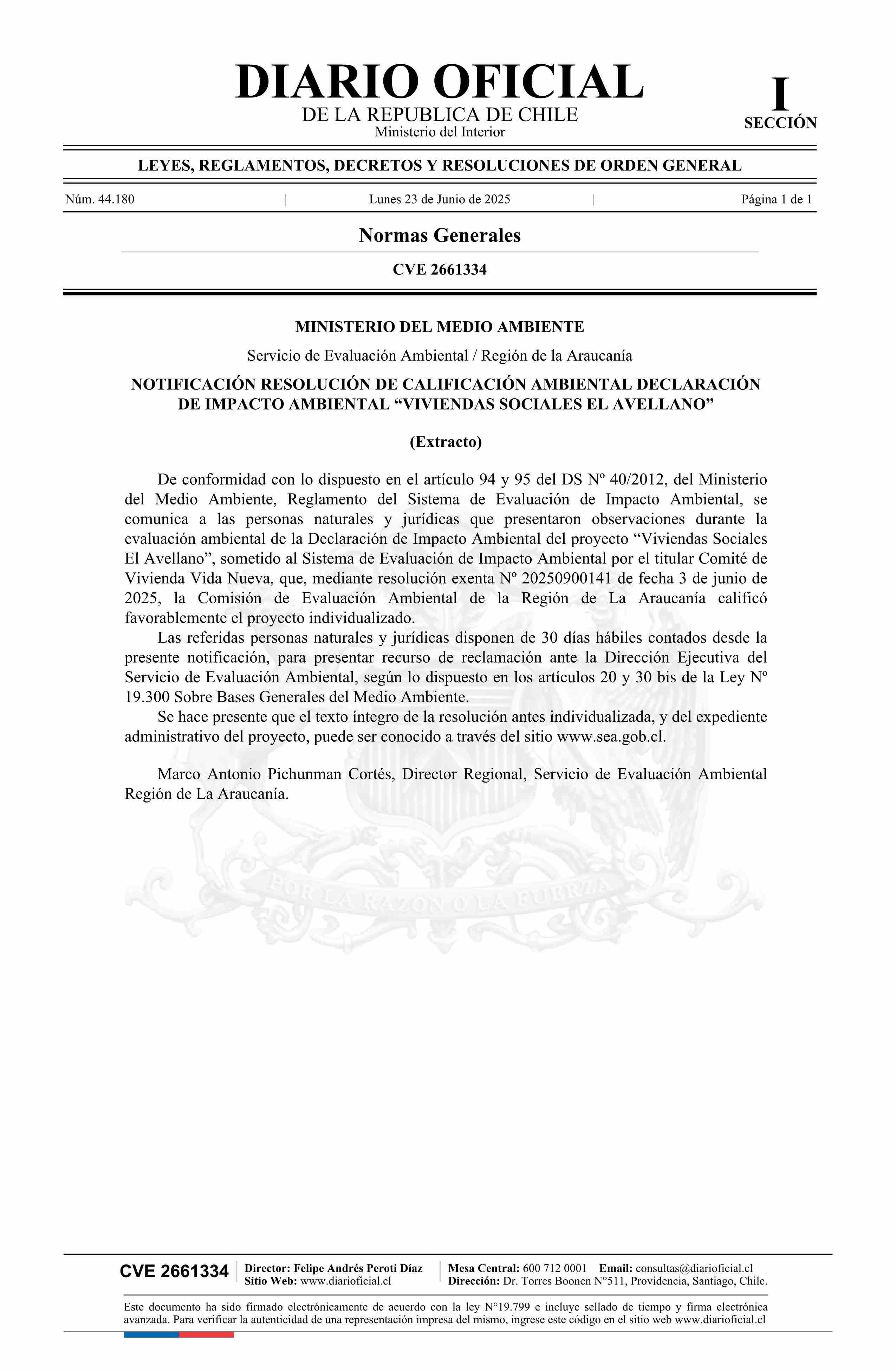 | Título: | Extracto de resolución exenta número 20250900141, de 2025.- Notifica Resolución de Calificación Ambiental de la Declaración de Impacto Ambiental del proyecto Viviendas Sociales El Avellano |