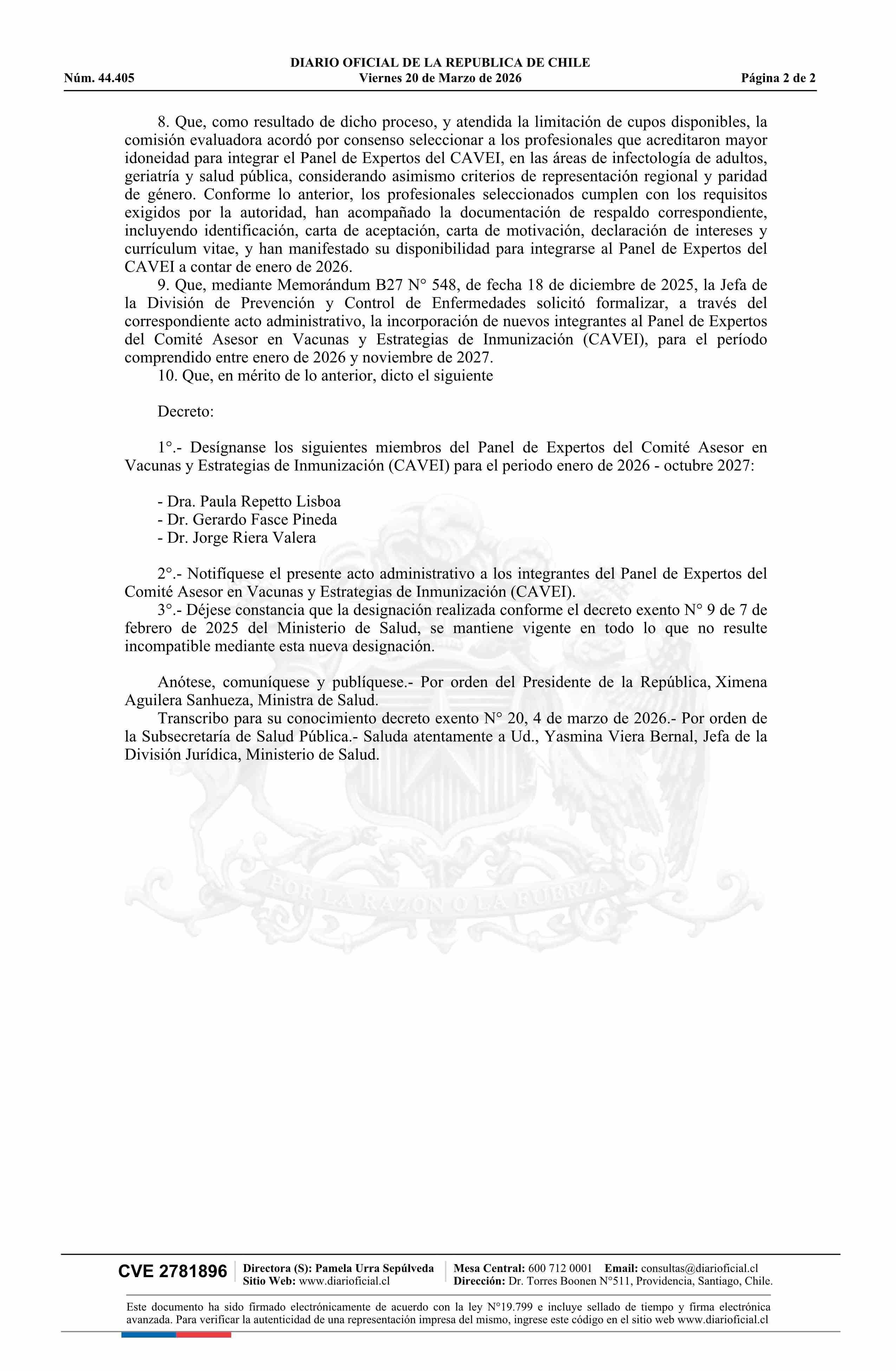 | Título: | Decreto exento número 20, de 2026.- Designa Miembros del Panel de Expertos del Comité Asesor en Vacunas y Estrategia de Inmunización |