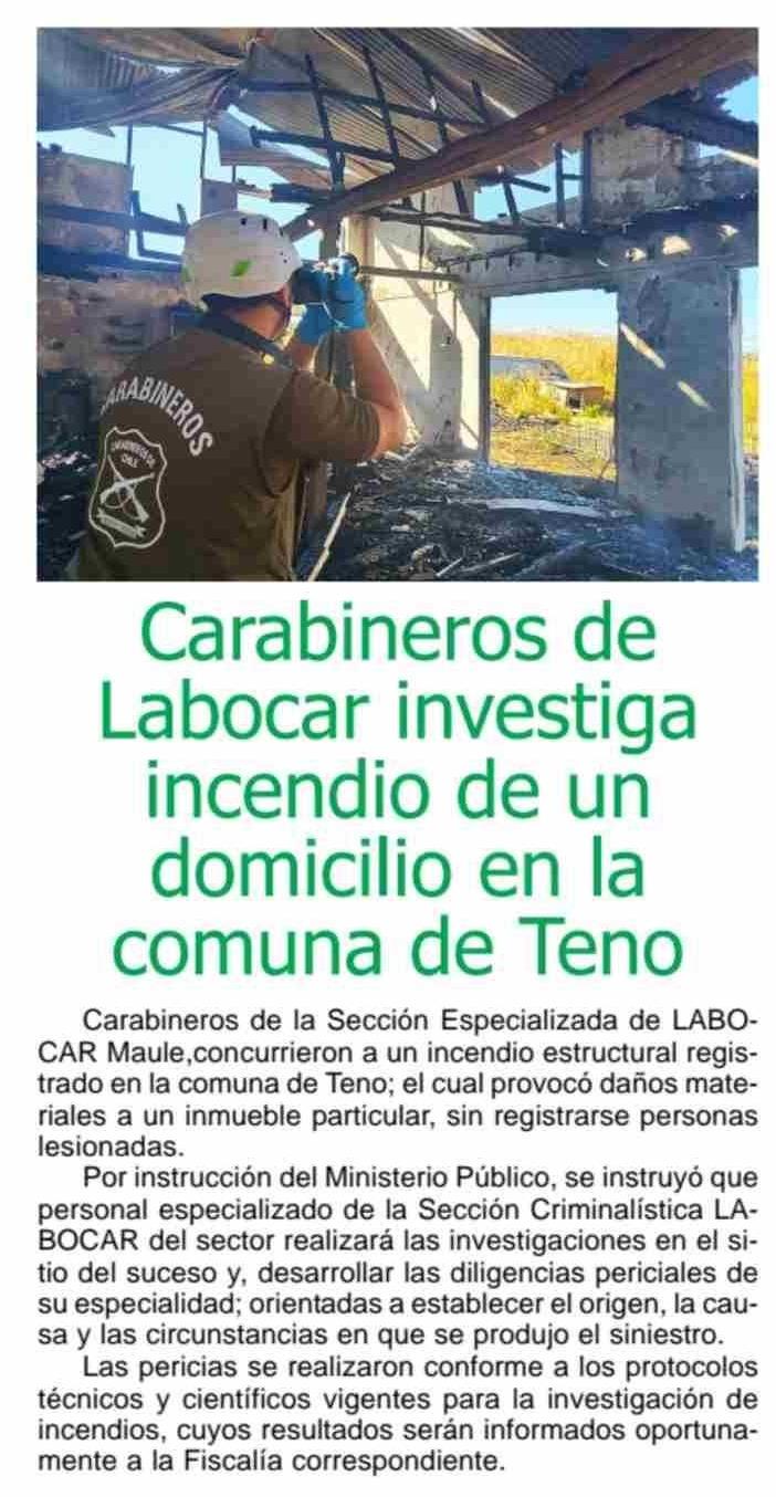 Carabineros de Labocar investiga incendio de un domicilio en la comuna de Teno
