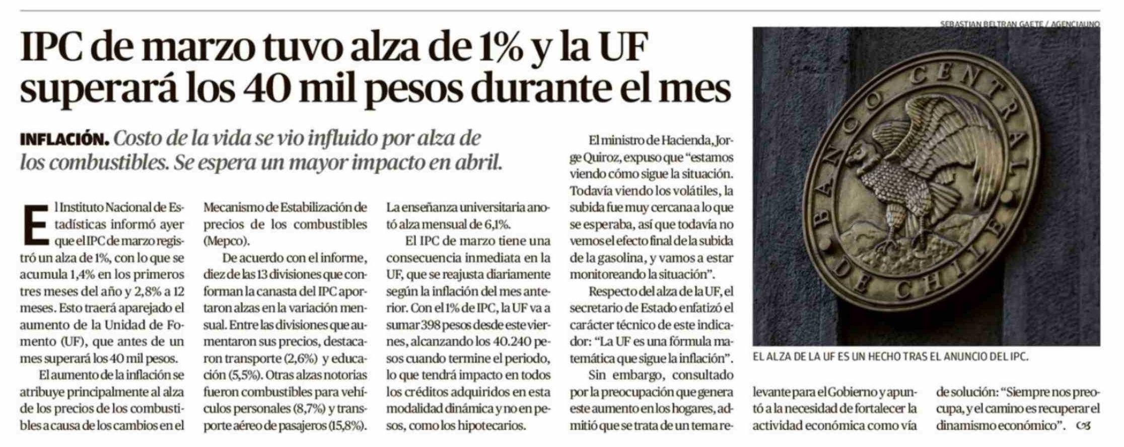 Título: IPC de marzo tuvo alza de 1% y la UF superará los 40 mil pesos durante el mes