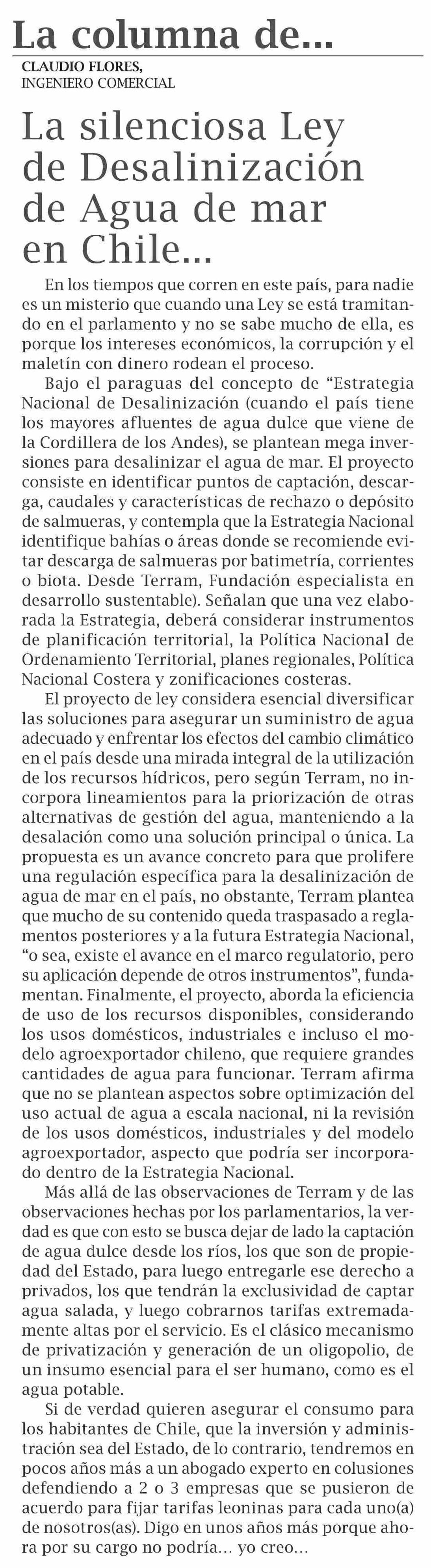 COLUMNAS DE OPINIÓN: La silenciosa Ley de Desalinización de Agua de mar en Chile...