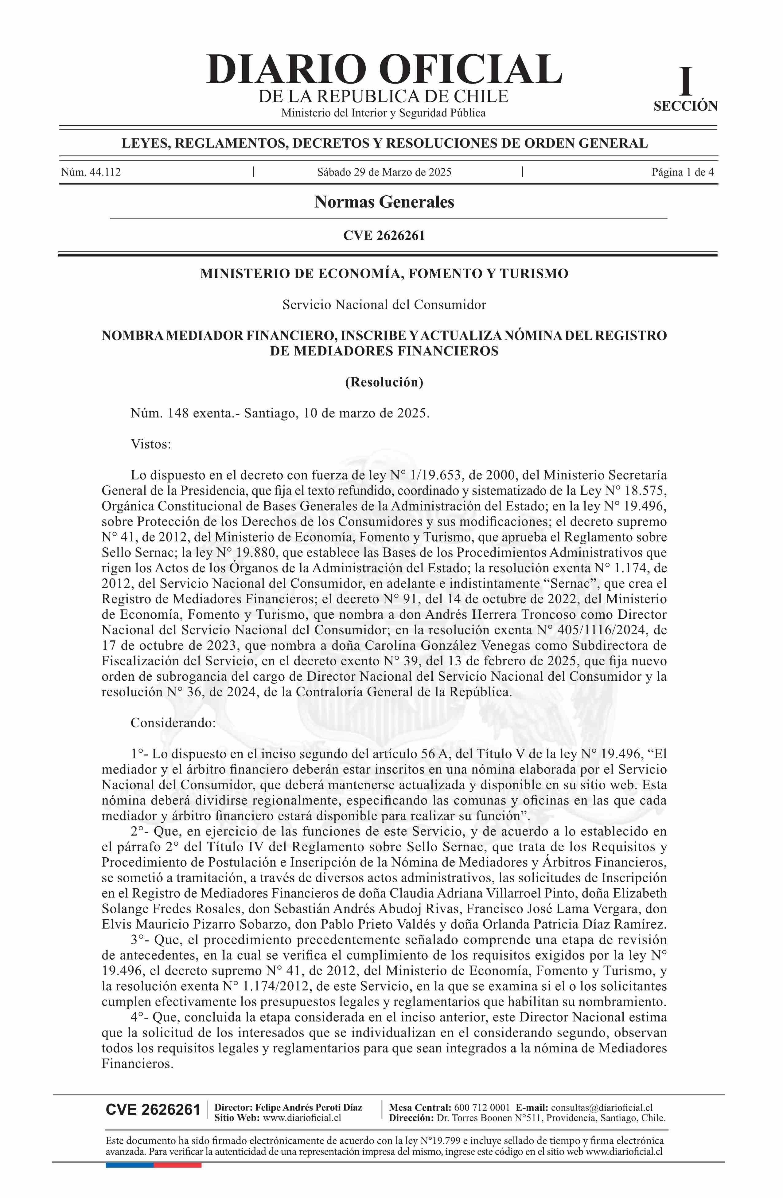 | Título: | Resolución exenta número 148, de 2025.- Nombra Mediador Financiero, inscribe y actualiza nómina del Registro de Mediadores Financieros |