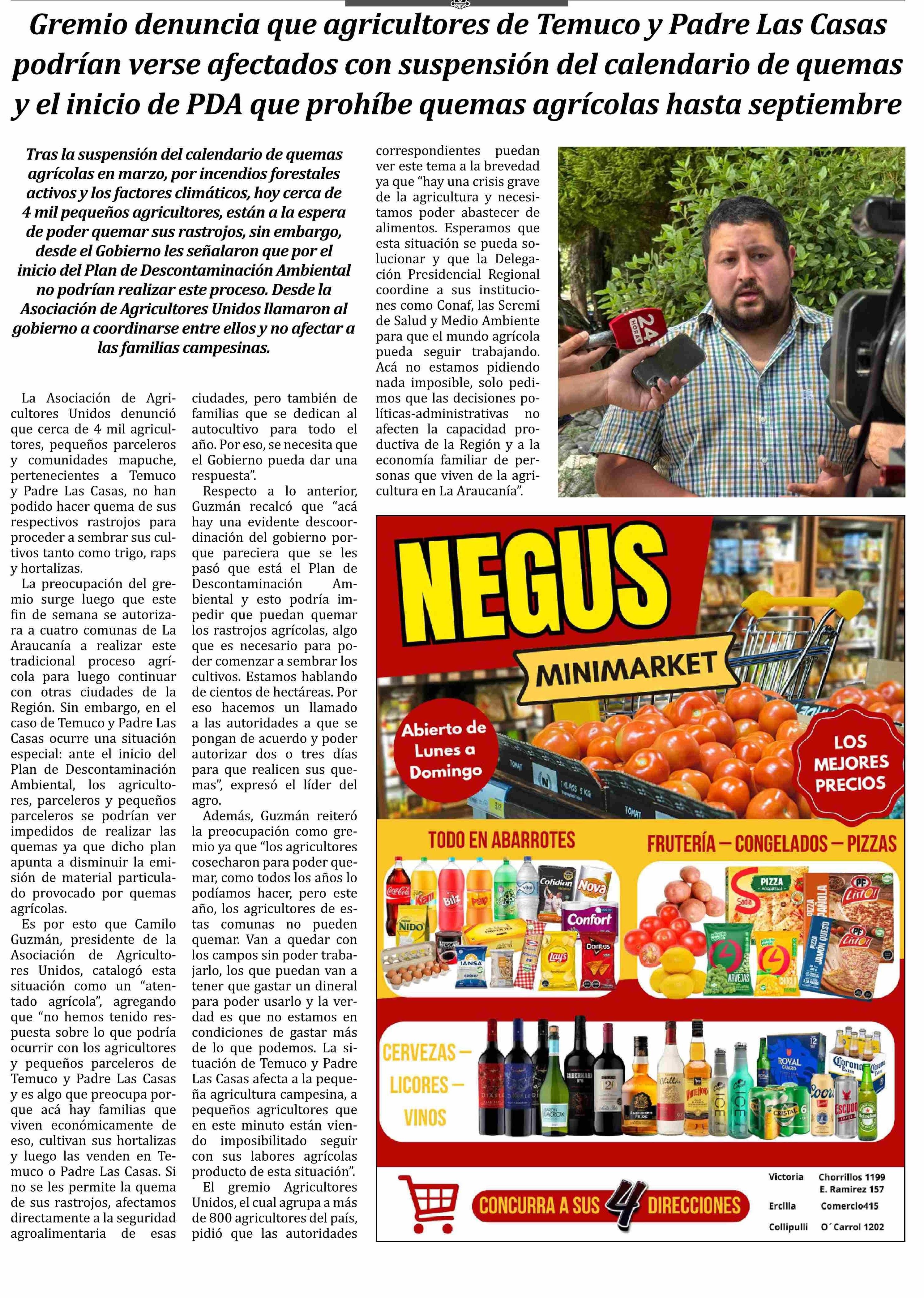 Título: Gremio denuncia que agricultores de Temuco y Padre Las Casas podrían verse afectados con suspensión del calendario de quemas y el inicio de PDA que prohíbe quemas agrícolas hasta septiembre