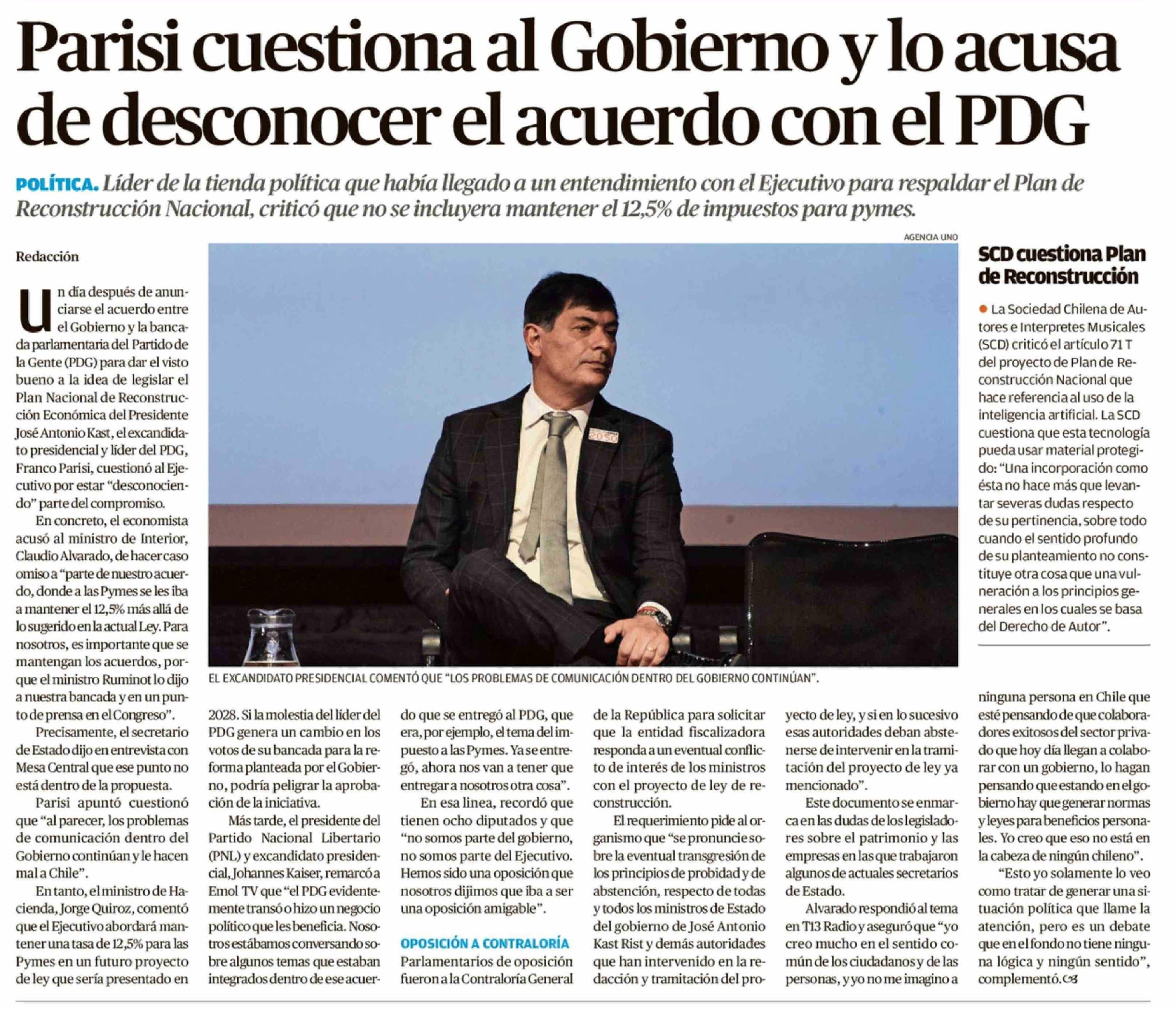 Parisi cuestiona al Gobierno y lo acusa de desconocer el acuerdo con el PDG