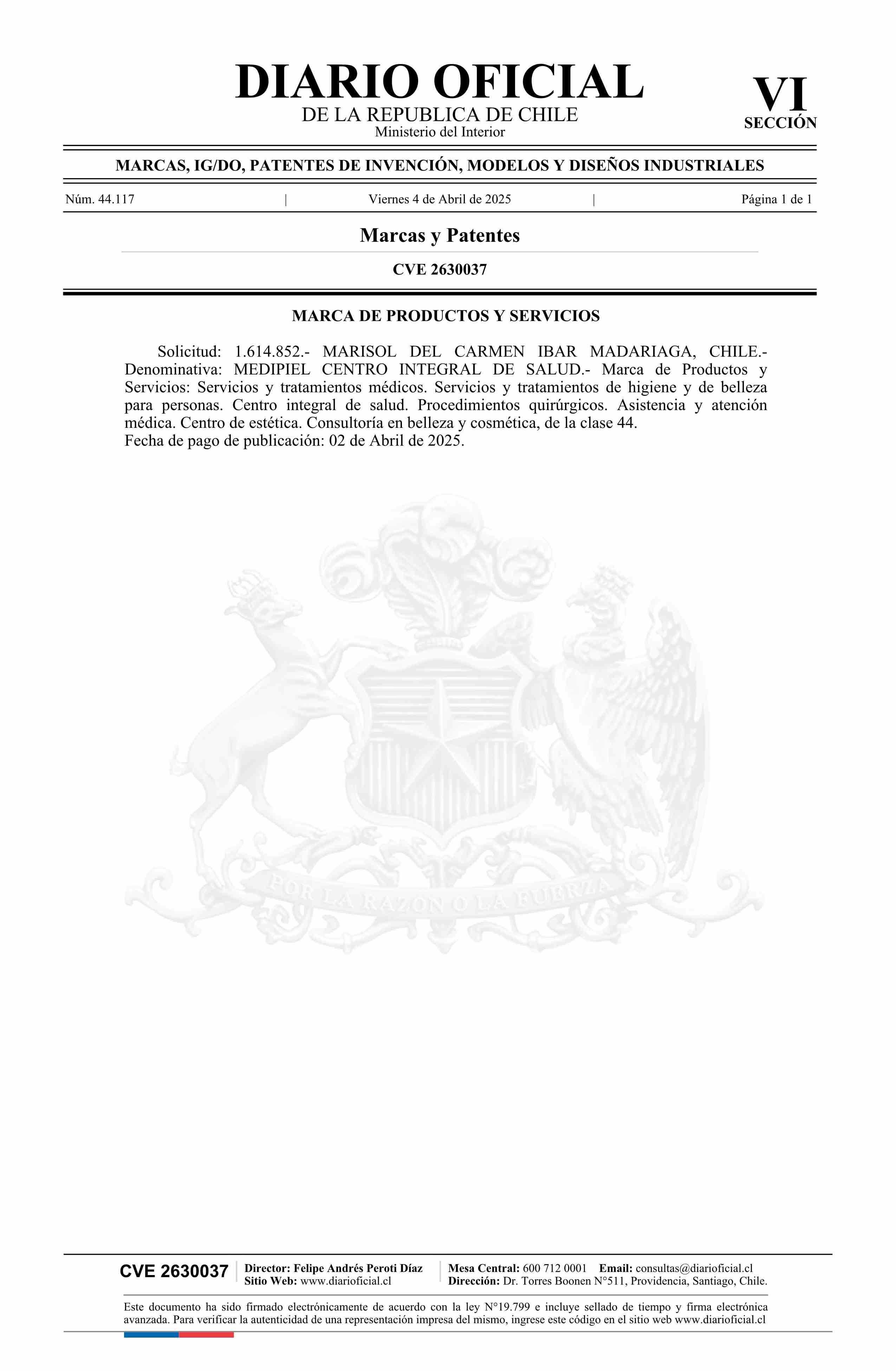 Solicitud número 1614852.- MEDIPIEL CENTRO INTEGRAL DE SALUD