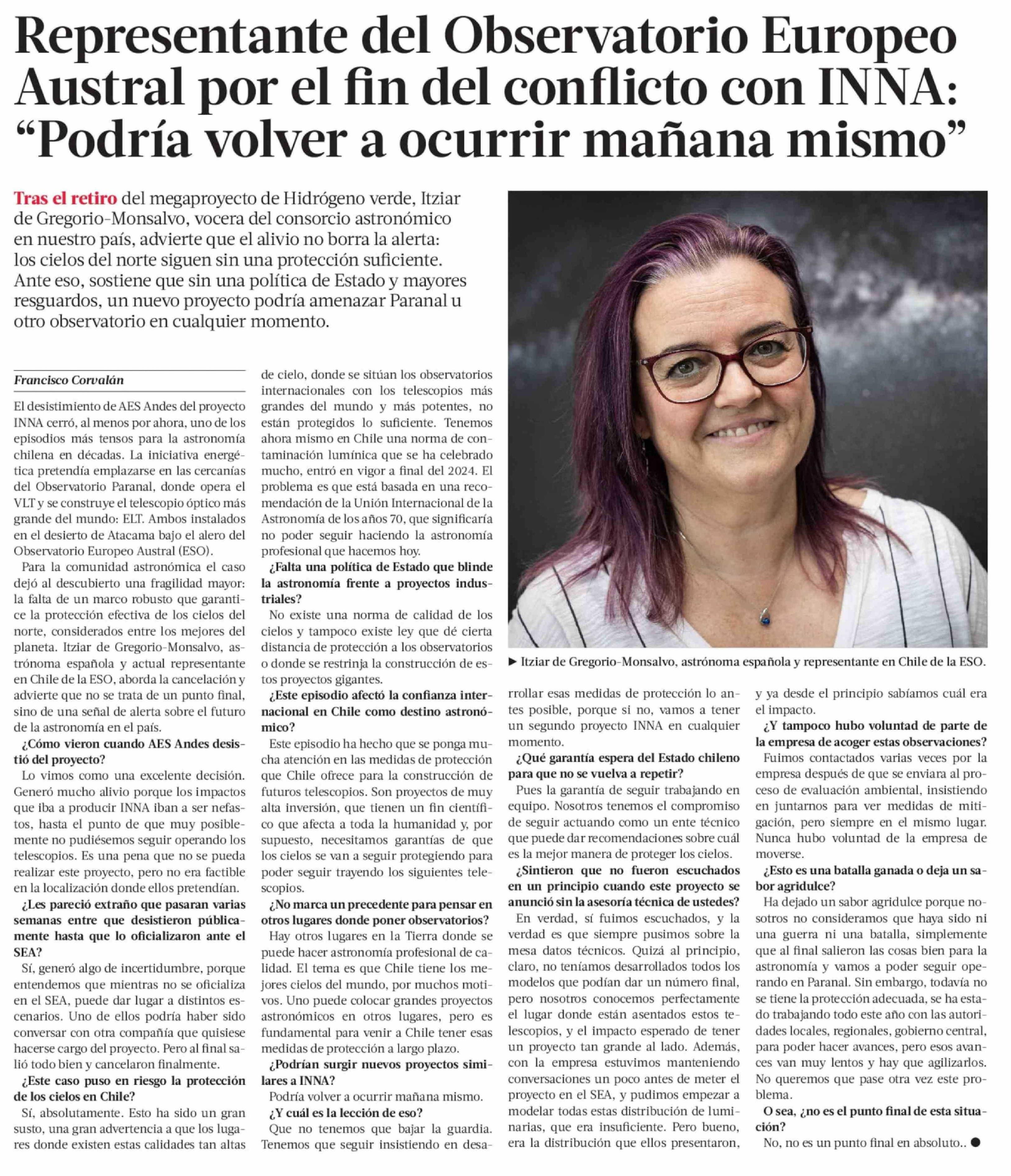 Representante del Observatorio Europeo Austral por el fin del conflicto con INNA: "Podría volver a ocurrir mañana mismo"