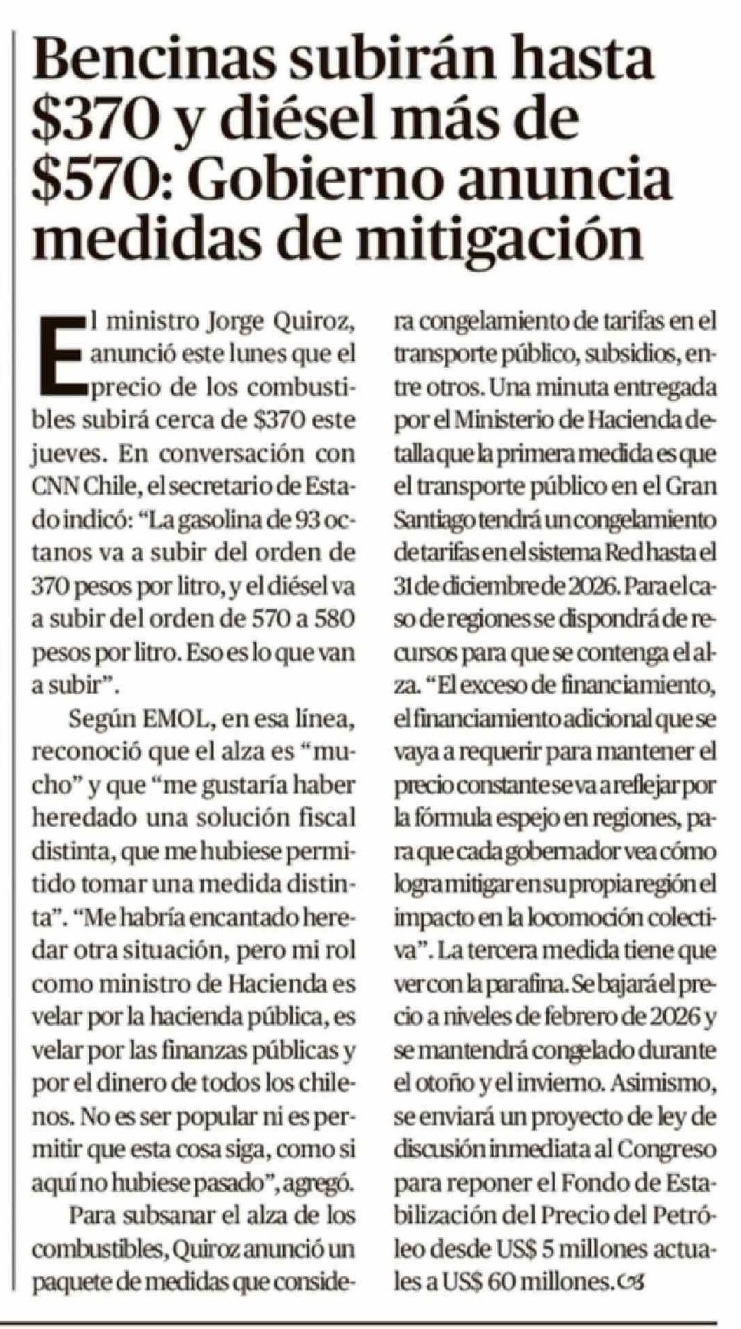 Bencinas subirán hasta $370 y diésel más de $570: Gobierno anuncia medidas de mitigación