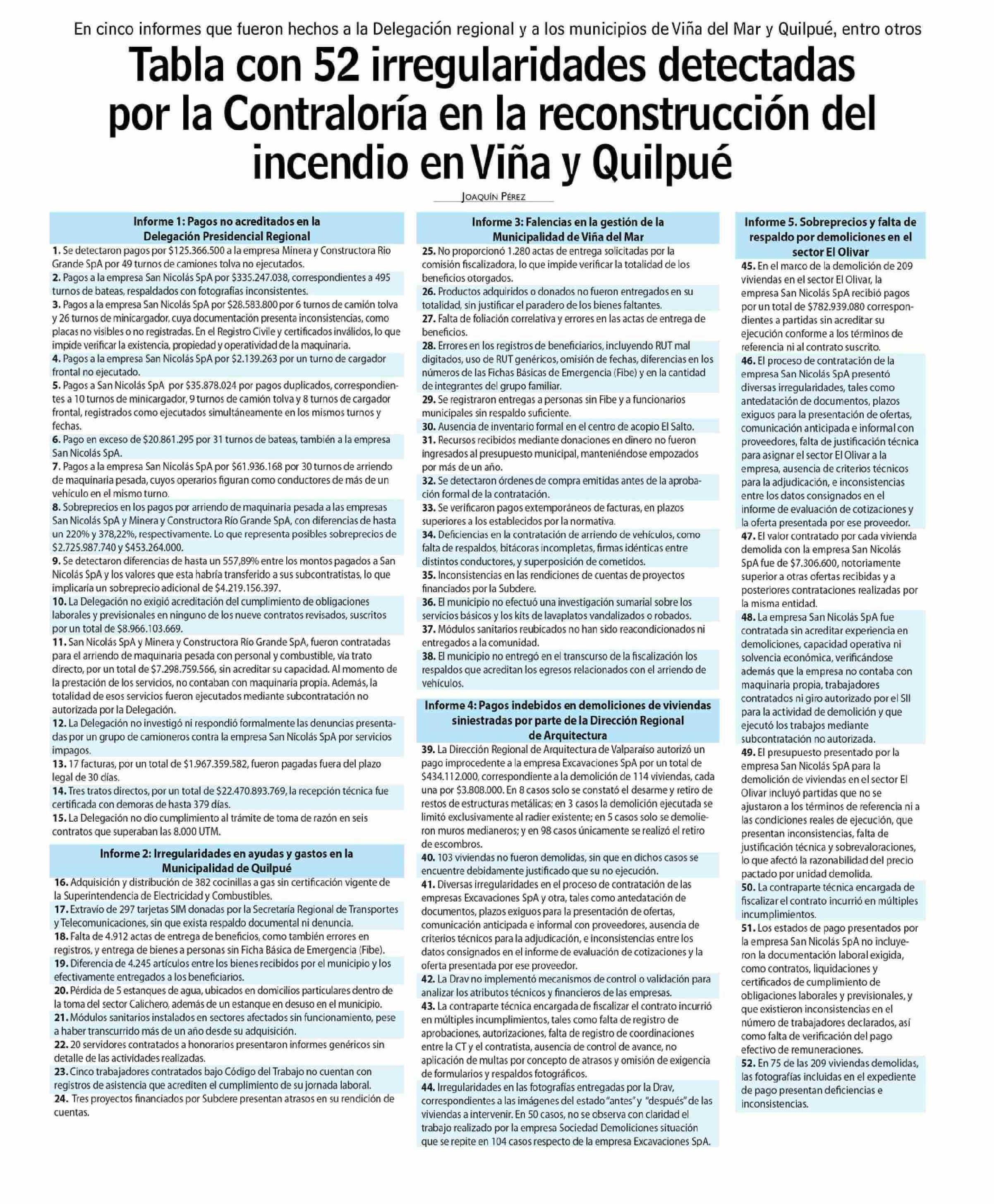 | Título: | Tabla con 52 irregularidades detectadas por la Contraloría en la reconstrucción del incendio en Viña y Quilpué |